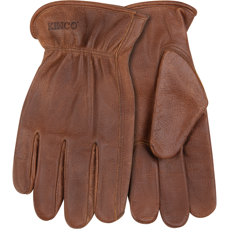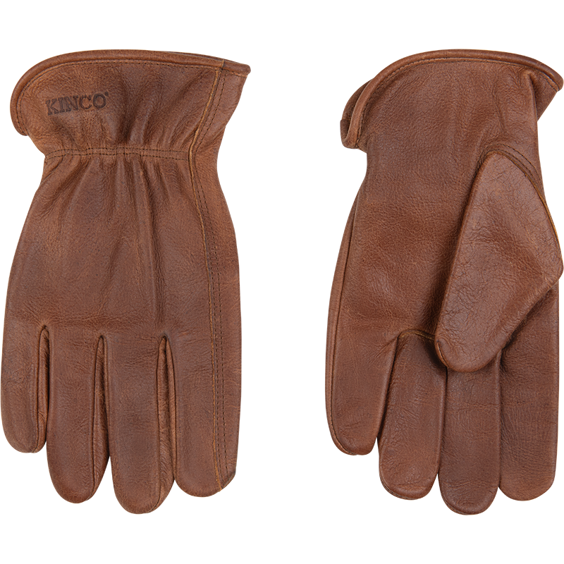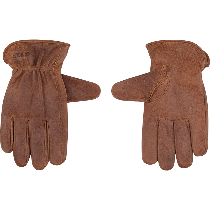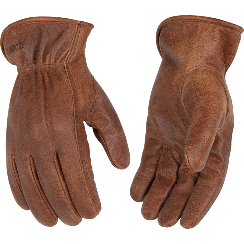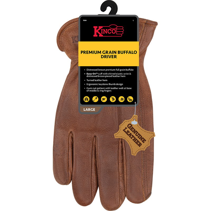 Product Name Premium Grain Buffalo Driver SKU 1084 Hero Description With a worn-in look and a comfortable grain leather feel, these unlined leather drivers are a hardworking companion for all your farm and carpentry projects. For a secure fit, a shirred elastic wrist cinches the glove down against your wrist, while an ergonomic keystone thumb gives you a full range of thumb motion. An Easy-On™ cuff lets you quickly pull them on or off. Receipt Description Kinco Leather Glove Short Description - Distressed brown premium full grain buffalo