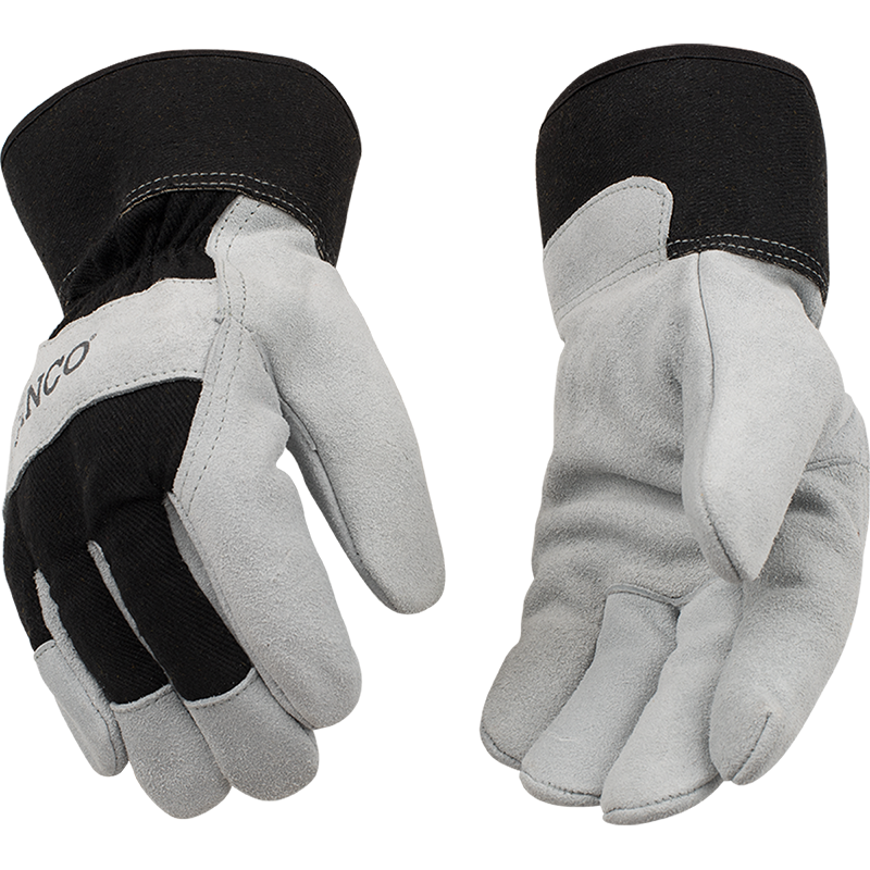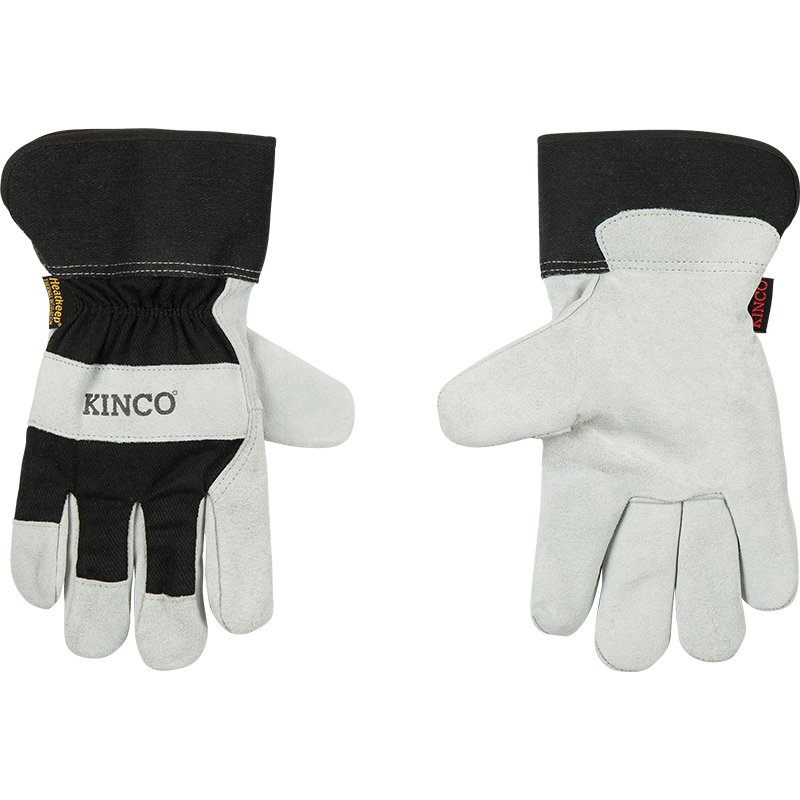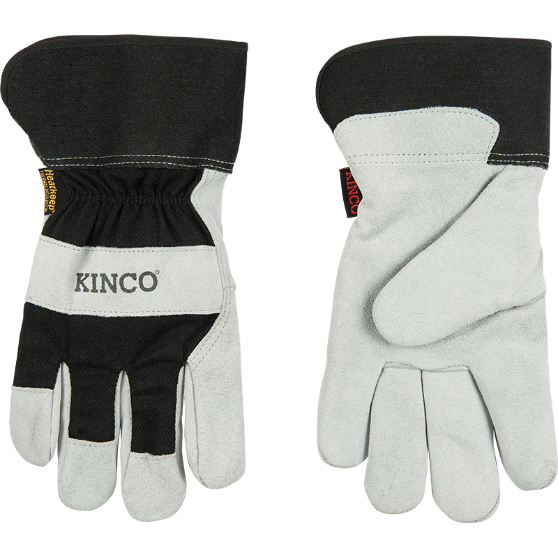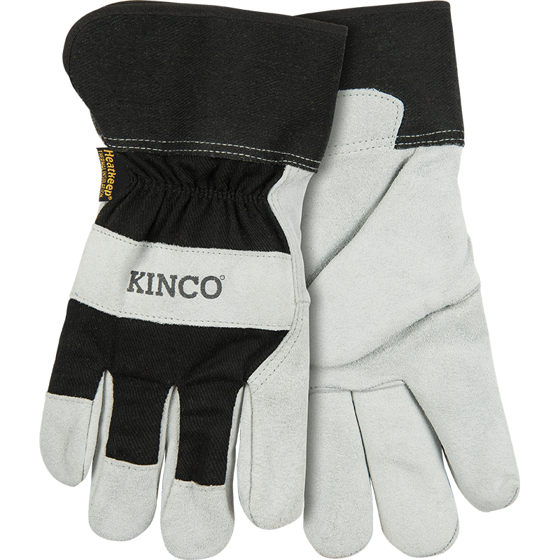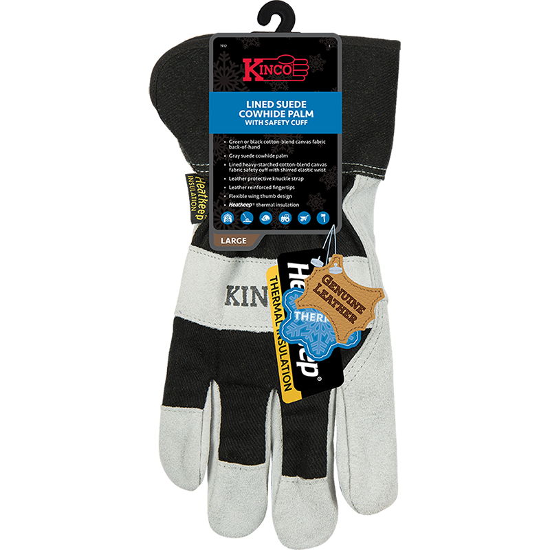 Product Name Lined Suede Cowhide Palm with Safety Cuff SKU 1932-L Hero Description These gloves have the goods to keep your hands feeling fresh and protected in even the coldest conditions, thanks to their thermal lining and deeply durable cowhide-meets-canvas construction. Reinforcement in the knuckle and fingertips adds extra protection where you need it most, and a lined, rubberized safety cuff keeps your wrist out of harm’s way. From farm labor to snow and ice removal to outdoor recreation, they’re as versatile as the work you do. Price List Description Lined Suede Cowhide Palm with Safety Cuff, Large Receipt Description Kinco Leather Palm Glove Short Description - Black cotton-blend canvas fabric back-of-hand
