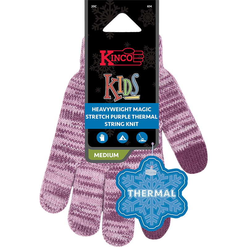 Product Name Kids' Heavyweight Magic Stretch Purple Thermal String Knit SKU 20C-KM Hero Description Heavyweight and stretchy? That’s the magic of these thermal string knit gloves. The secret’s in their innovative blend of 10-gauge acrylic-spandex, which creates a sturdy yet flexible fabric. They slip on snug, wick away moisture, and keep out the cold. And with their touch-screen compatible thumb and index fingertip material, you don’t even have to take them off to use a smartphone. When your work is done, simply throw them in the washer for easy cleaning. Price List Description NEW! Kids' Heather Purple Heavyweight 10-Gauge Magic Stretch Thermal String Knit, Kids' Medium (Available Fall 2026) Receipt Description Kinco Kids' Textile Glove Short Description - Heather purple thermal 10-gauge acrylic-spandex blend knit shell