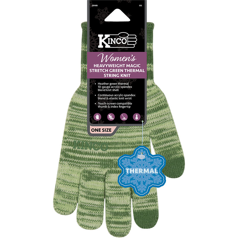 Price List Description NEW! Women's Heather Purple Heavyweight 10-Gauge Magic Stretch Thermal String Knit, One Size (Available Fall 2026) Receipt Description (30-Character Max) Kinco Women's Textile Glove Hero Description (Benefits Statement) Heavyweight and stretchy? That’s the magic of these thermal string knit gloves. The secret’s in their innovative blend of 10-gauge acrylic-spandex, which creates a sturdy yet flexible fabric. They slip on snug, wick away moisture, and keep out the cold. And with their touch-screen compatible thumb and index fingertip material, you don’t even have to take them off to use a smartphone. When your work is done, simply throw them in the washer for easy cleaning. Available in women’s-specific sizing. Short Description - Heather green thermal 10-gauge acrylic-spandex blend knit shell