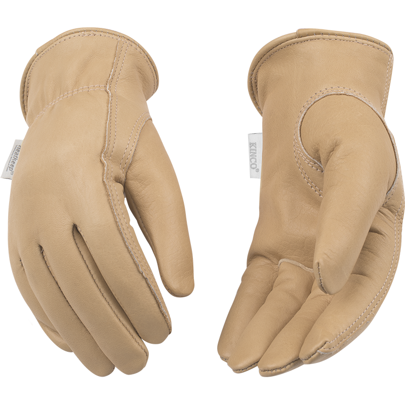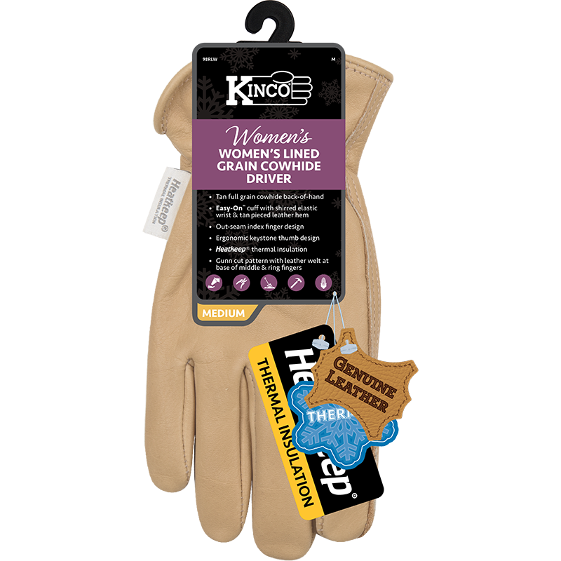 Product Name Women's Lined Grain Cowhide Driver SKU 98RLW-L Hero Description Durable and warm, these women’s cowhide drivers are ready for all jobs in cold weather. Full grain cowhide gives them long-lasting wear you can count on, with an innovative design meant to minimize friction on the palm. The Heatkeep® thermal insulation keeps your hands feeling fresh from a job’s start to finish. Price List Description Women's Lined Grain Cowhide Driver, Large Receipt Description Kinco Leather Glove Short Description - Tan full grain cowhide back-of-hand