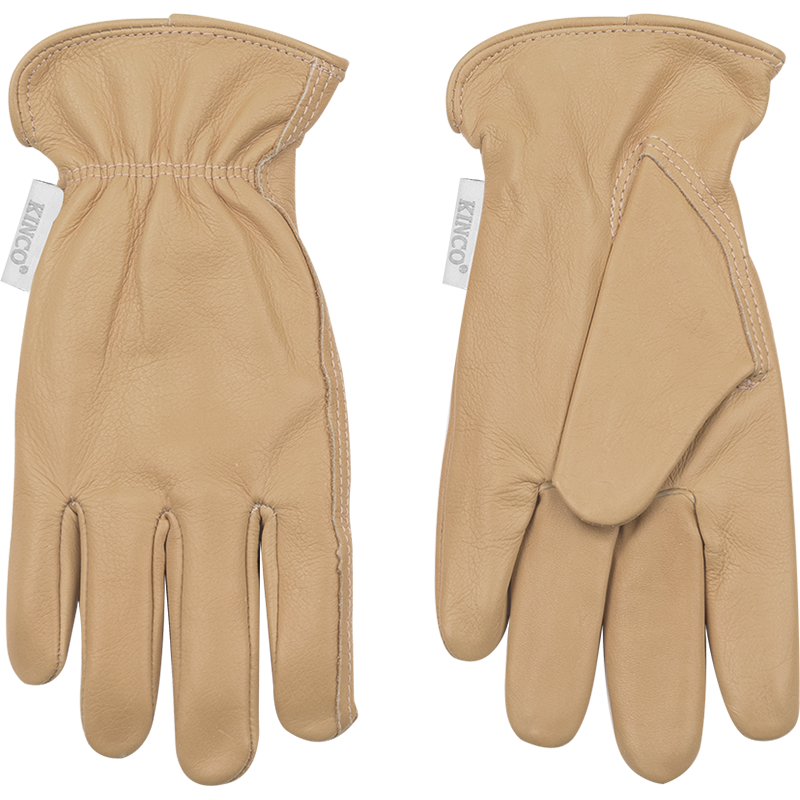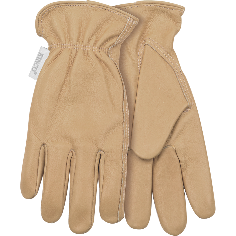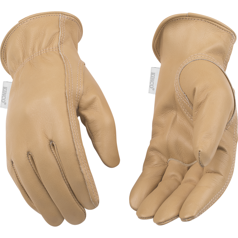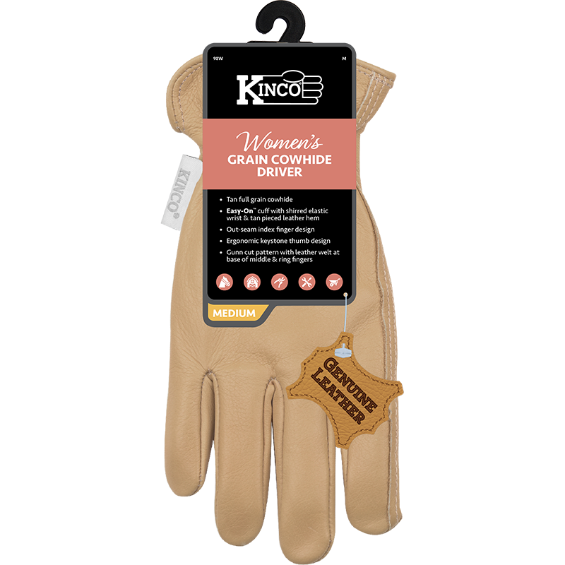 Product Name Women’s Grain Cowhide Driver SKU 98W-L Hero Description Durability is the name of the game with these tough, naturally water-repellent grain cowhide drivers. Their wear-resistant design features an ergonomic thumb that lets your fifth finger move just like it would without the glove on—perfect for everything from home improvement projects to lawn and garden maintenance. Available in women’s-specific sizing. Price List Description Women’s Grain Cowhide Driver, Large Receipt Description Kinco Leather Glove Short Description - Tan full grain cowhide