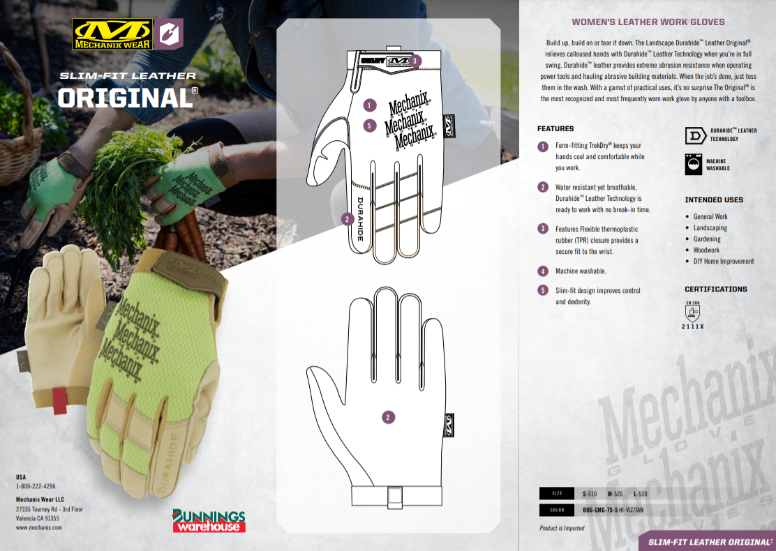 Primary Feature Comfortable Fit Primary Benefit Form-fitting TrekDry® helps keep working hands cool and comfortable while you work. Secondary Feature Leather Secondary Benefit Durahide™ leather protects your palm with extreme abrasion resistance. Intended Uses - General Work