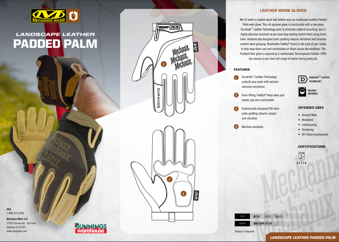 Durahide™ Leather Technology protects your palm with extreme abrasion resistance Form-fitting TrekDry® material keeps working hands cool and comfortable Touchscreen compatible Machine washable Color Tan UPC Pair/Each 781513662274 Size Large Manufacturer Part Number BUG-LSPP-75-010 Country of Origin Package Quantity IP 4 Package Quantity MB 60 Proto 3477 Region APAC Rolling Change No
