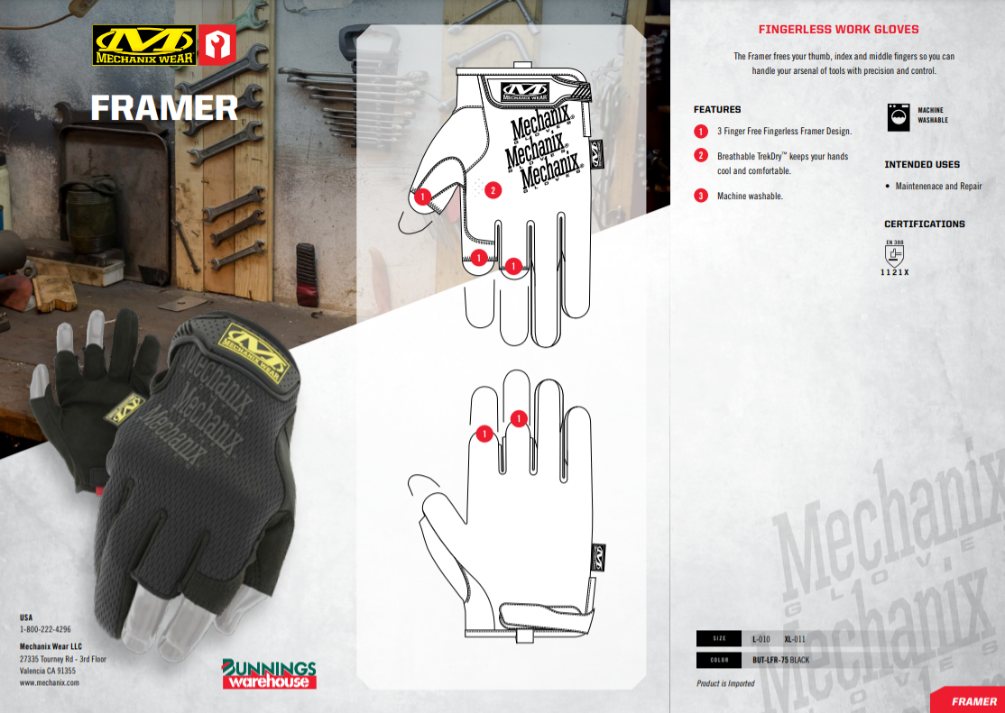 Primary Feature Fingerless Design Primary Benefit Fingerless design delivers more dexterity when measuring, cutting, and framing. Secondary Feature Leather Secondary Benefit Durahide™ performance leather protects your palm with extreme abrasion resistance. Intended Uses - Carpentry & Woodwork