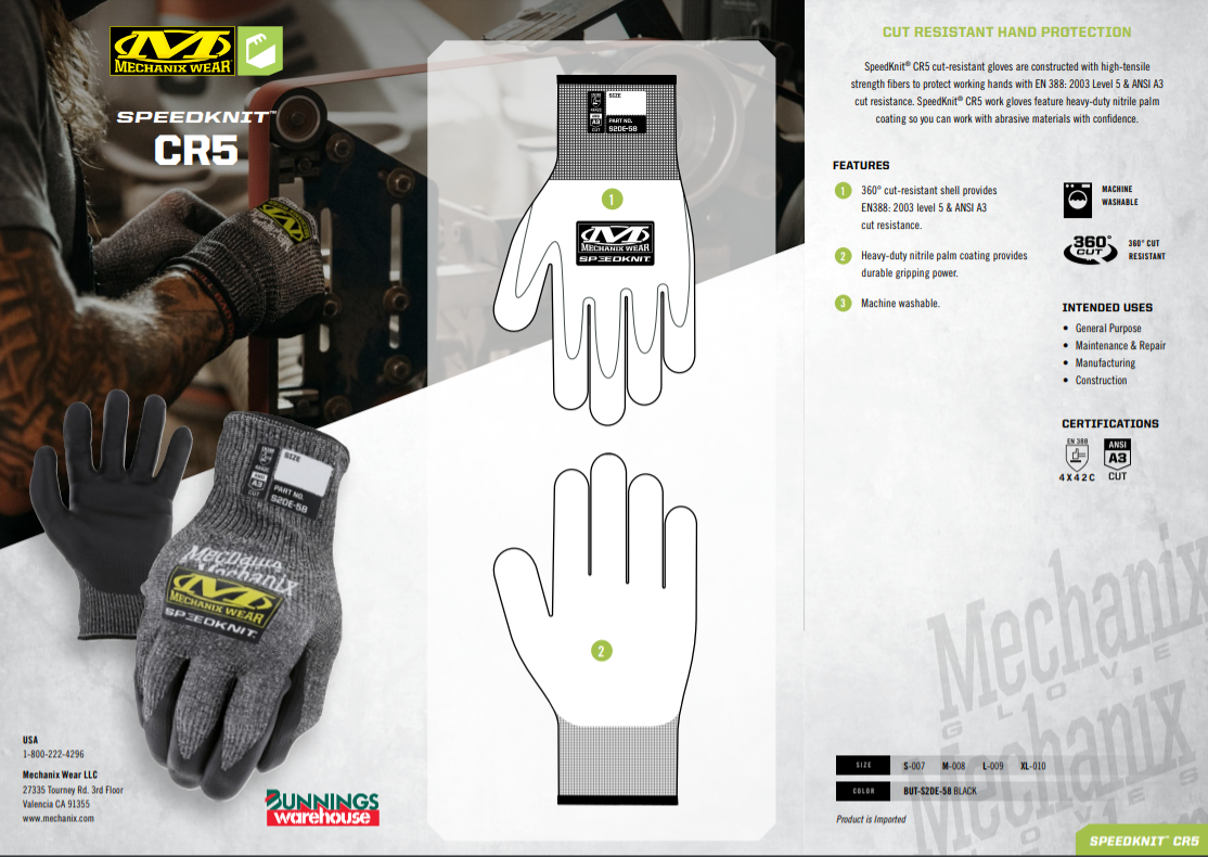 Primary Feature Cut Resistant Primary Benefit 360° cut-resistant shell provides EN 388: 2003 level 5 & ANSI A3 cut resistance. Secondary Feature Grip Secondary Benefit Heavy-duty nitrile palm coating provides durable grip in wet and dry conditions. Intended Uses - Maintenance & Repair
