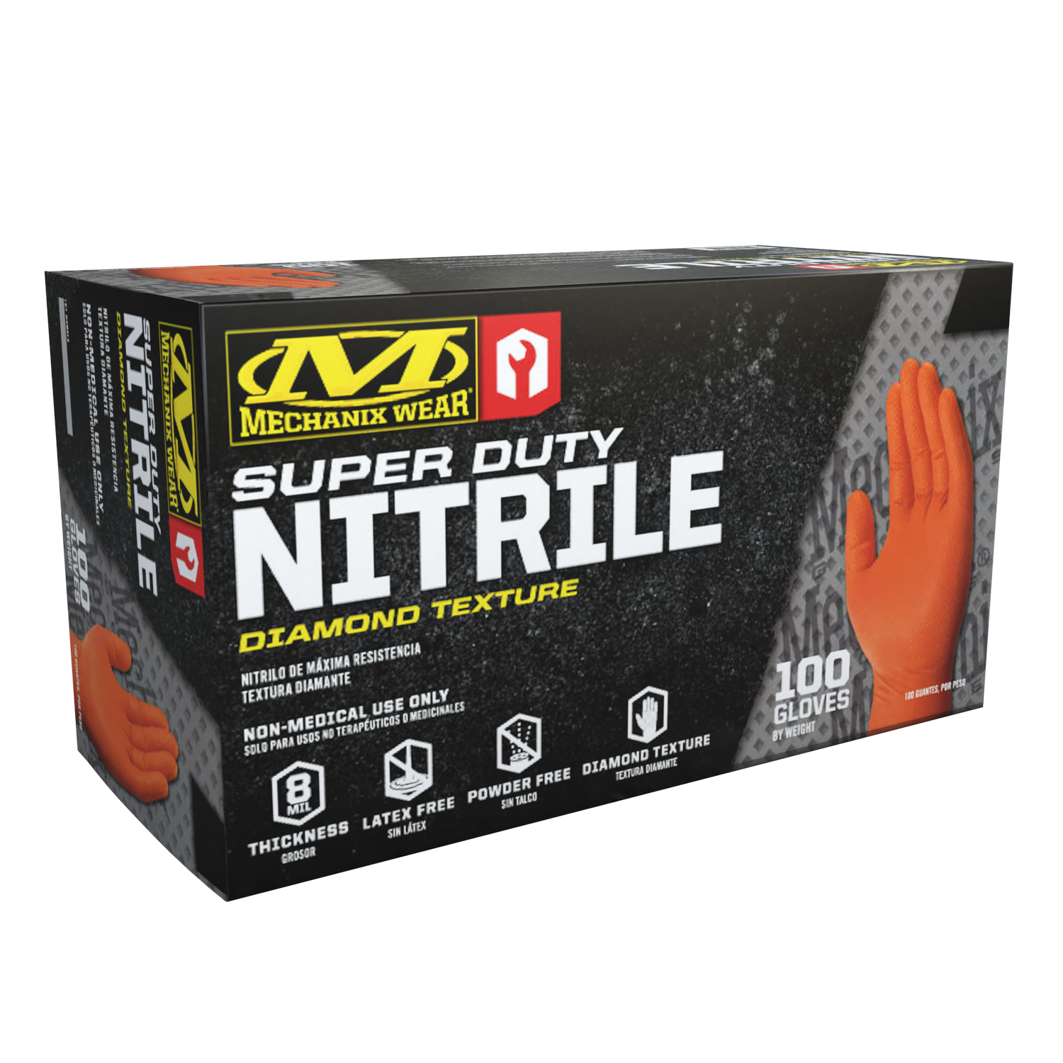 Mechanix Wear 8 mil Super Duty Nitrile Gloves are powder-free and protect your hands from dirt, grease, oil and chemicals during messy jobs. Textured diamond grip throughout the palm and fingers insure you’ll have traction with your tools no matter what you’re working on.