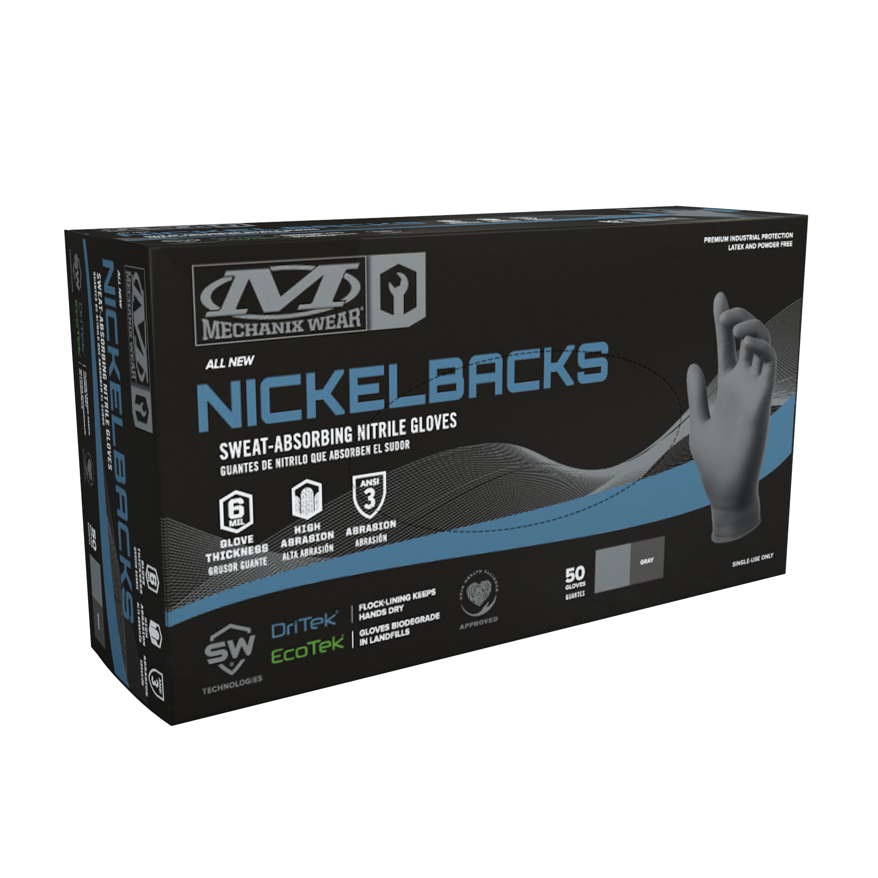 Mechanix Wear has partnered with SW®, a leading manufacturer of performance-oriented hand protection products to develop the Nickelbacks 6 Mil Sweat-Absorbing Nitrile Glove. This 6 Mil Sweat-Absorbing Nitrile Glove features a number of SW® advanced proprietary technologies to maximize performance, durability and comfort. The 6 Mil Nickelbacks are designed to absorb sweat and keep hands cool and comfortable for extended use and provide trusted protection against dirt, grease, oil and chemicals.