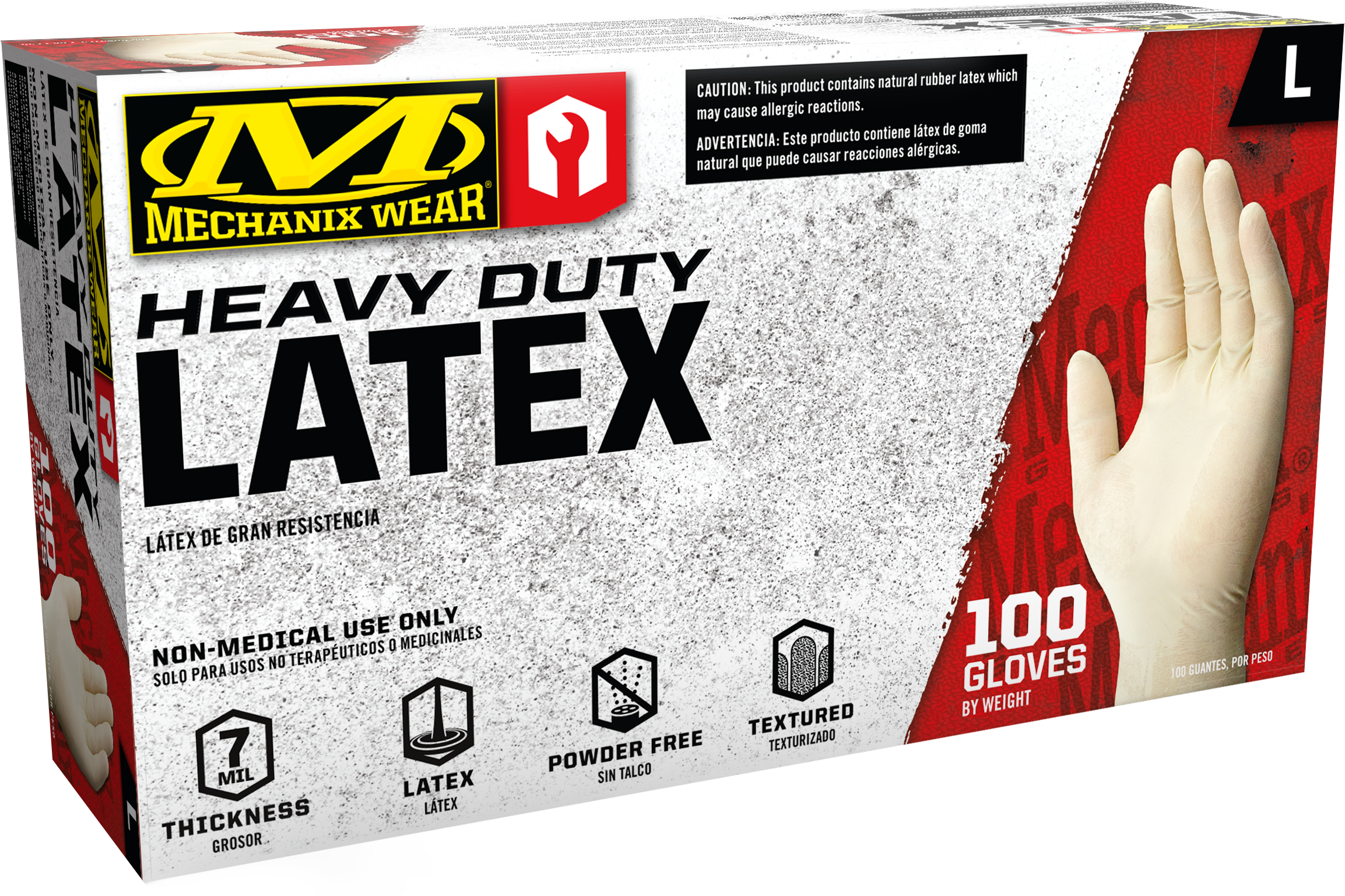 Mechanix Wear 7 mil Heavy-Duty Latex Gloves are powder-free and protect your hands from dirt, grease, oil and chemicals during messy jobs. Textured grip throughout the palm and fingers insure you’ll have traction with your tools no matter what you’re working on.