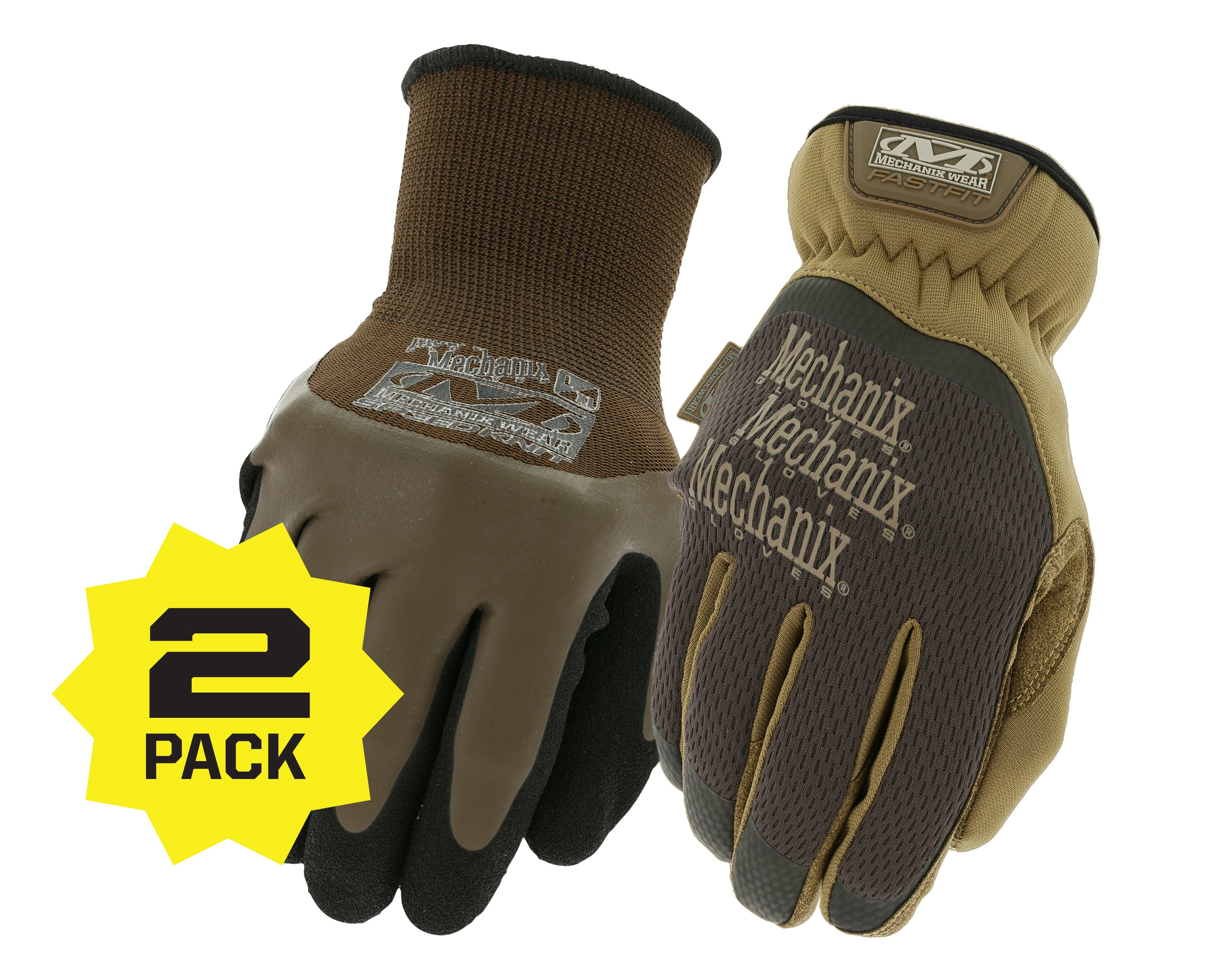 2 Pack includes one size large brown FastFit® and one size large brown SpeedKnit Pro. FastFit® work gloves take control with high-dexterity 0.6mm synthetic leather and stay connected with touchscreen technology in the palm of your hands. The FastFit delivers an unmatched fit with TrekDry™ evaporative cooling to keep your hands cool and comfortable. SpeedKnit Pro features 13 gauge support Lightweight, excellent dexterity and sensitivity and flat latex palm and fingers inner dip for liquid-proof fingers.