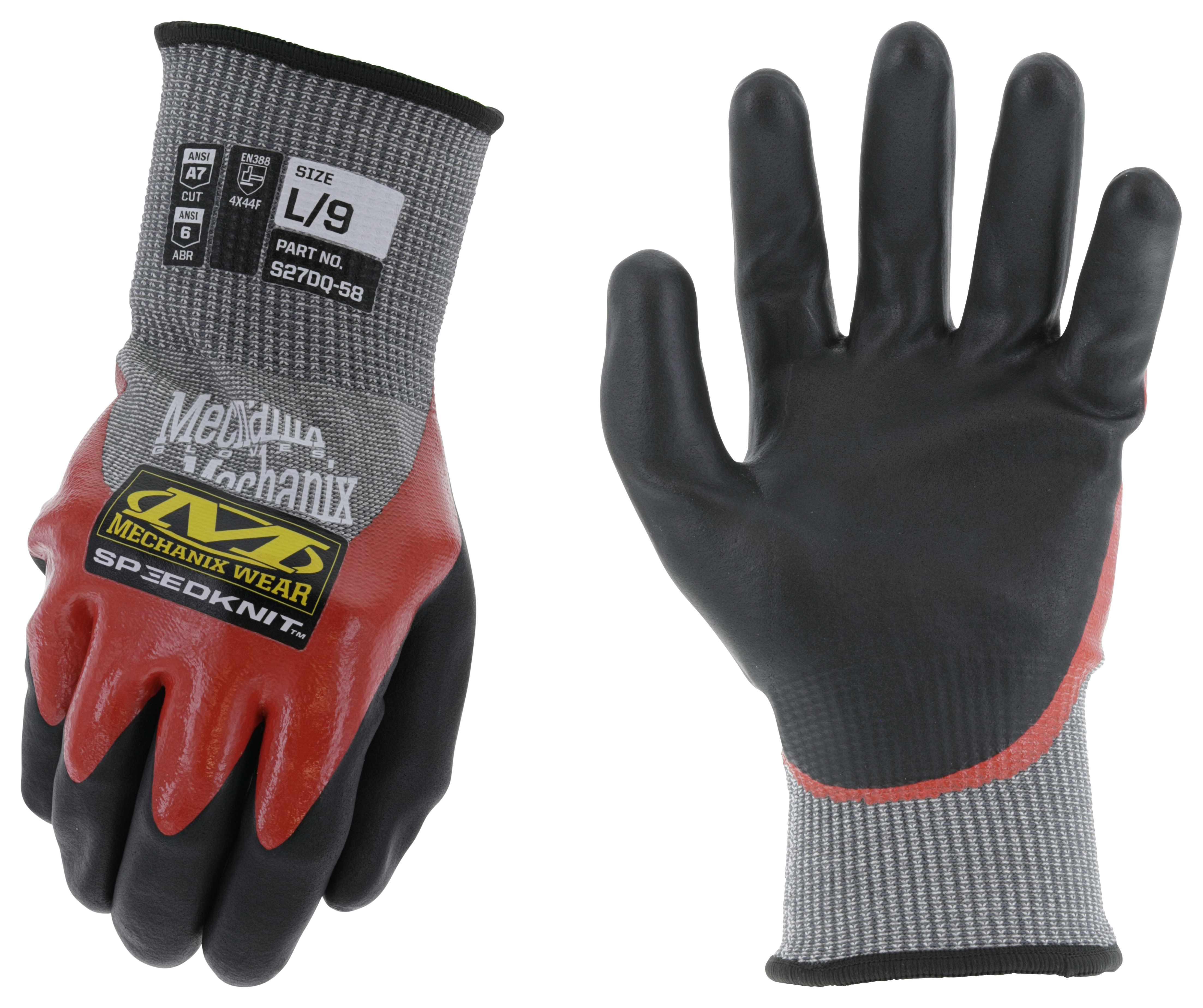 Shield against harmful chemicals with the SpeedKnit™ S27DQ58 gloves. The double-dipped proprietary nitrile bi-polymer coating combines a traditional palm coating on top of a 3/4 coating that extends from the fingers to the back of the hand provides a waterproof, chemical-resistant barrier. Wearers will find the 15-gauge HPPE blended shell enables ample dexterity and a snug fit with superior protection from high cut hazards meeting an ANSI cut level A7 and EN 388 level F cut resistance rating