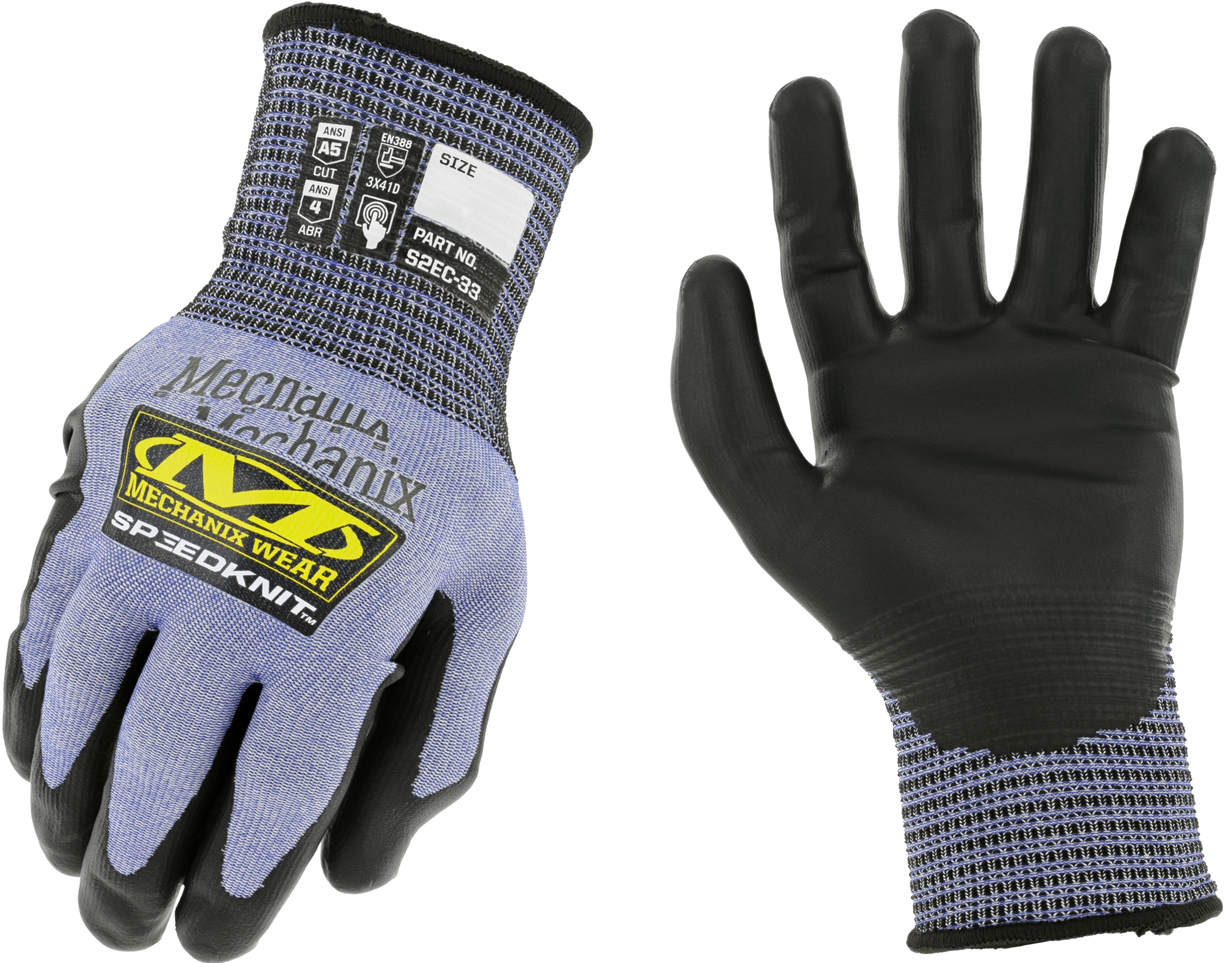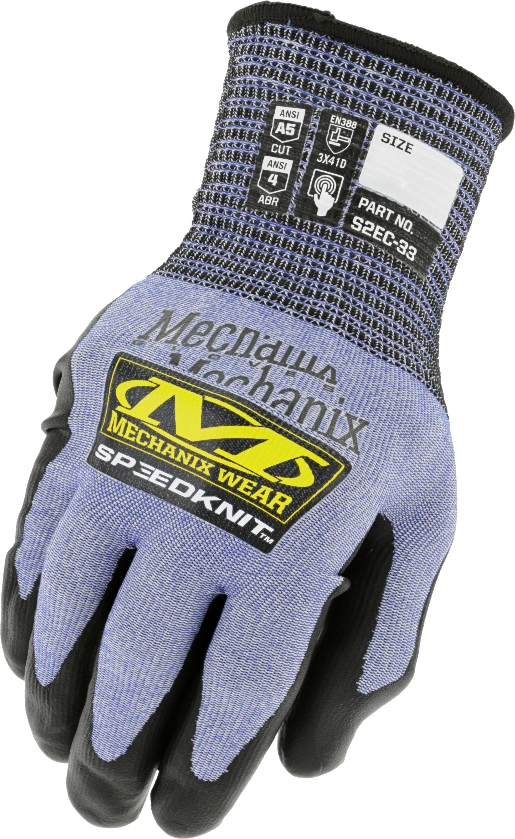 Our SpeedKnit™ S2EC33 cut gloves are in a category of their own, offering the highest level of dexterity and cut resistance to protect working hands with ANSI A5 blade-cut resistance. We use a machine-knit blend of HPPE and steel to create a high dexterity 18-gauge glove that maintains feel. The working side features environmentally friendly touchscreen capable water-based urethane coating to maintain grip in dry or wet conditions.