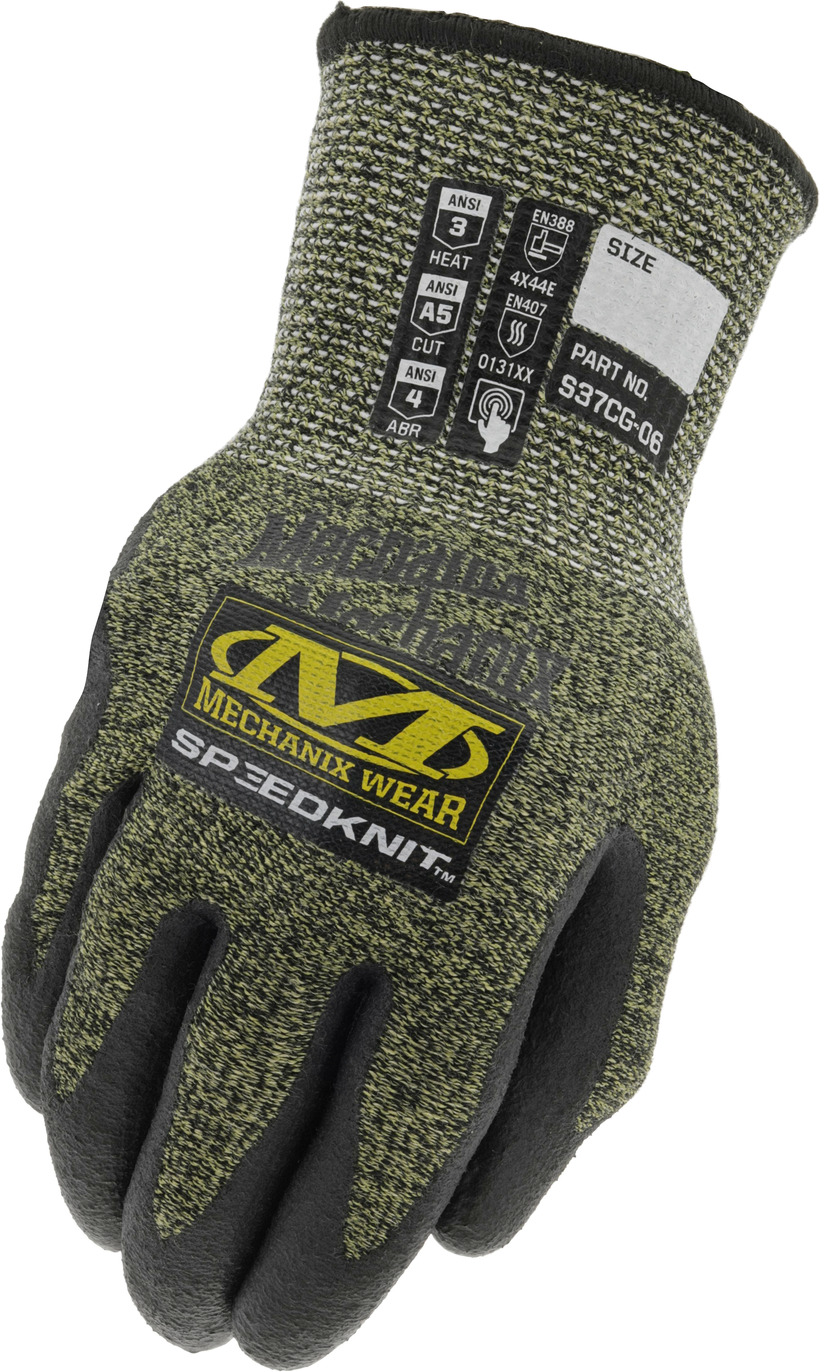 The SpeedKnit™ High Heat S37CG06 glove protect hands while working with hot materials and machinery. A comfortable 13-guage para-aramid blended machine knit shell conforms to your hand while blocking heat at an ANSI 3 heat resistance and provides an ANSI A5 cut resistance. The foam nitrile palm coating offers strong gripping power while increasing abrasion resistance that meets an ANSI level 4 rating so you can continue to work with confidence when manipulating hot parts and materials.