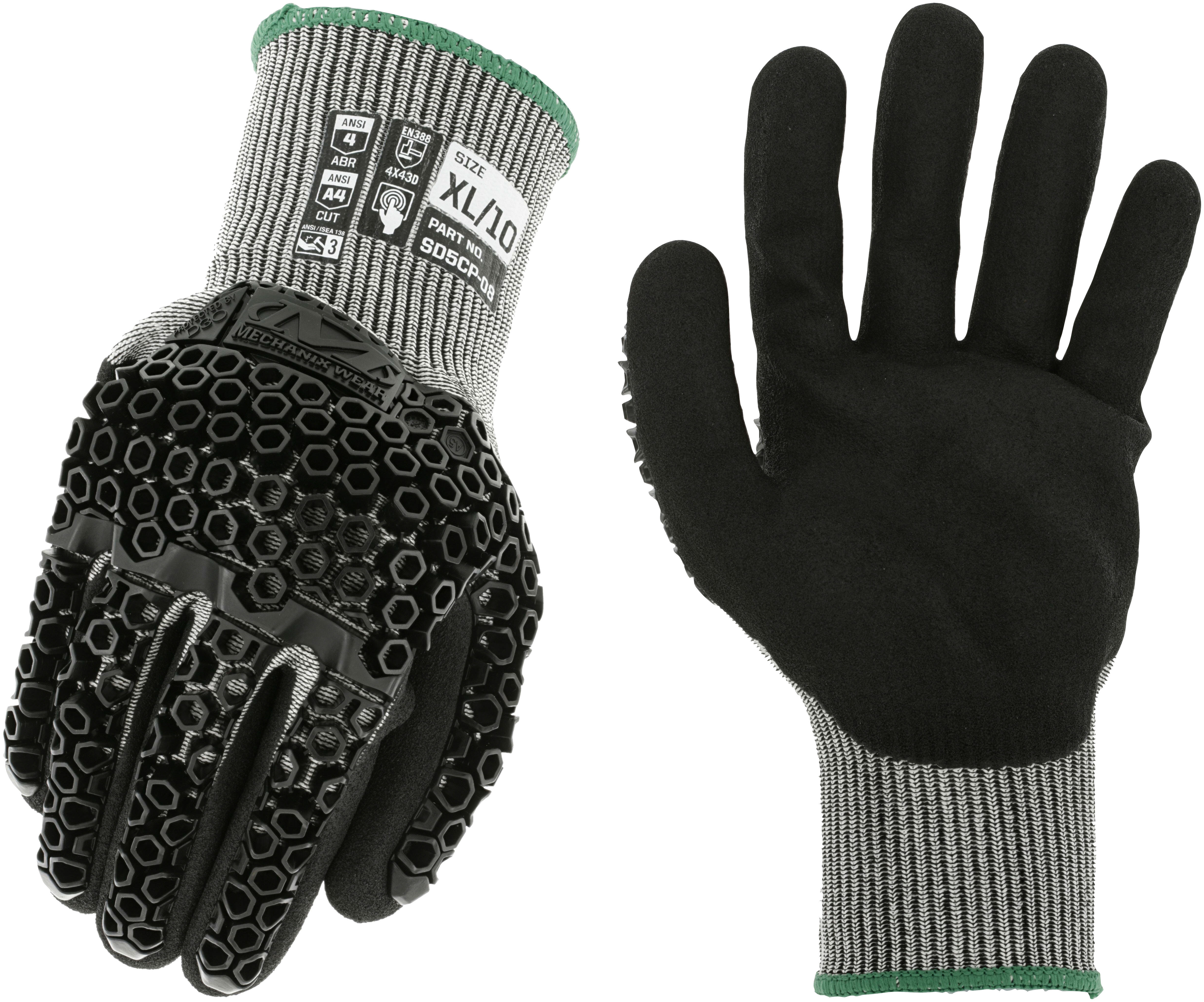 Heavy duty 13-gauge HPPE + Steel knit construction protects against lacerations and harsh skin abrasions. Comfortable compression cuffs provide a secure fit. Patented D3O® Impact Print™ technology protects with ANSI 138 Level 3 impact resistance. Rugged sandy nitrile palm coating with textured grip offers high abrasion resistance and dry grip performance. Durability performance meets ANSI Level 4 abrasion standard. Cut performance meets ANSI A4 cut standard. Touchscreen capable to keep users safe and connected. REACH Compliant. Machine washable and dryable. Intended Uses Heavy Equipment Repair Construction Oil & Gas Mining Manufacturing Metalworking Rigging Towing Material Handling