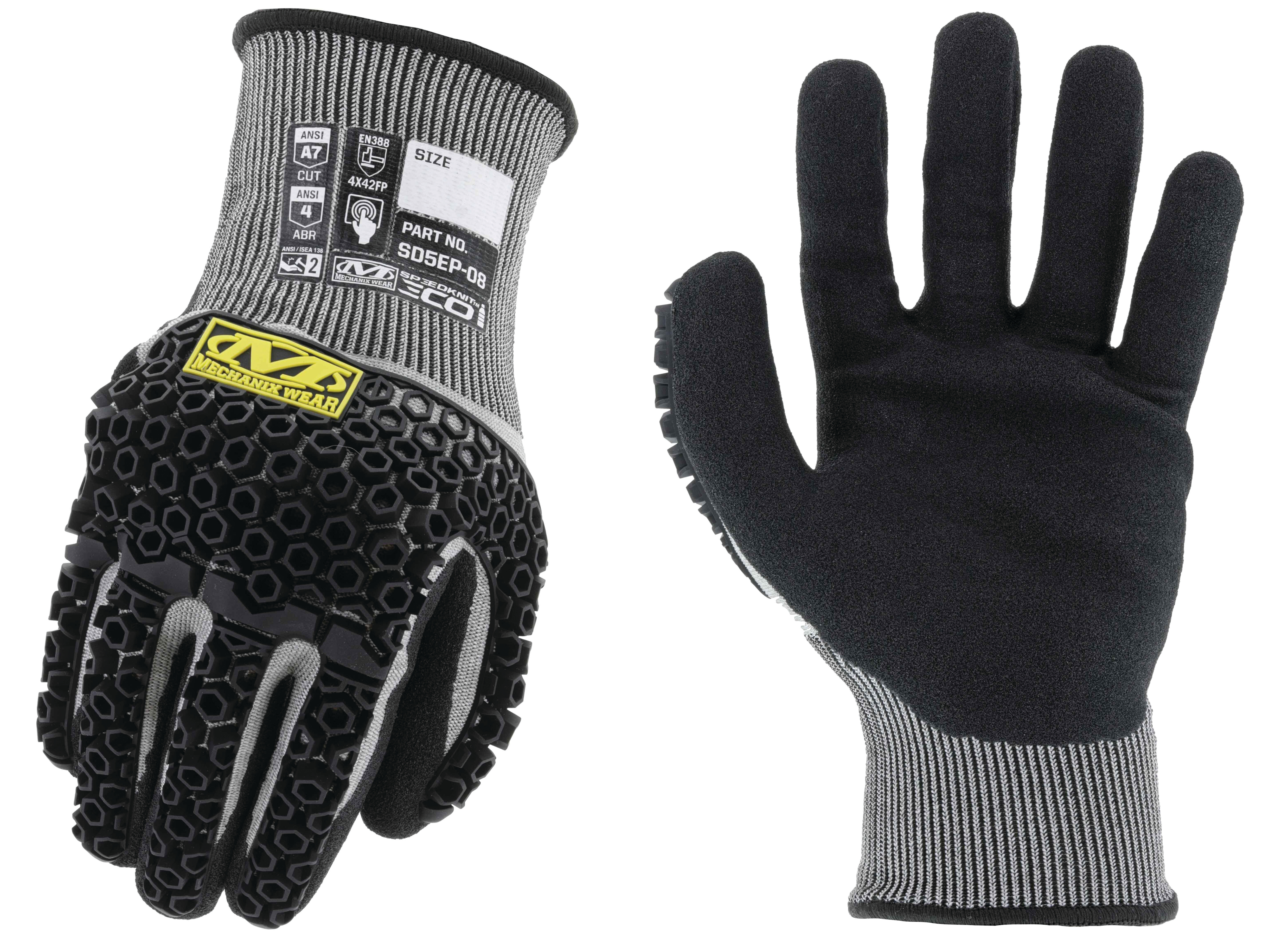 SpeedKnit™ Eco M-Pact® Our SpeedKnit™ Eco M-Pact® gloves are the first glove of its kind to achieve ANSI Level 2 impact resistance with unrivaled dexterity. Each pair contains one recycled PET plastic bottle, helping to keep plastic waste out of landfills and the natural environment. We use a high dexterity 18 gauge machine-knit blend of HPPE and tungsten steel to protect working hands with ANSI A7 blade-cut resistance. The working side features a touchscreen capable sandy nitrile palm coating with ANSI Level 4 abrasion resistance for high durability and abrasion protection for working hands..