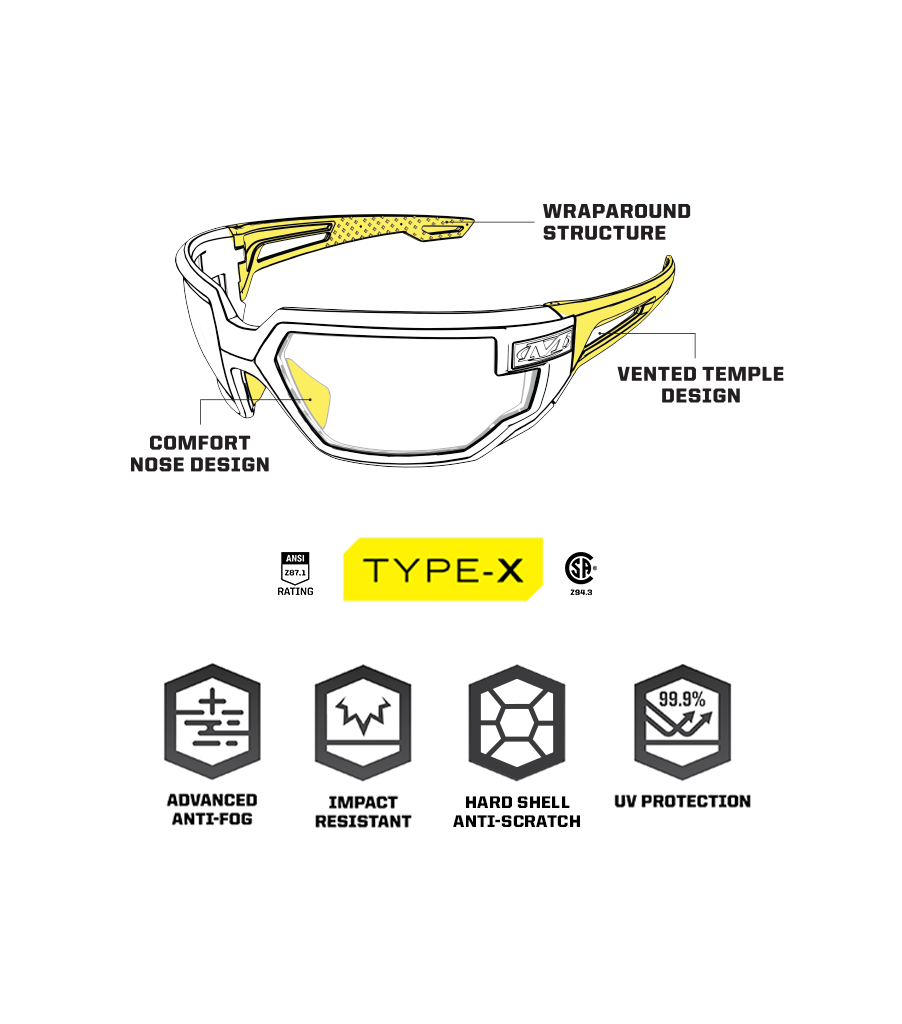 Vision Sport Type-X safety eyewear delivers comfortable protection with its impact-resistant polycarbonate full frame design geared towards protecting workers in the most rugged work environments and designed for shooting sports. The premium materials Vision Type-X are built with ensure long lasting durability and enhanced protection while the addition of advanced anti-fog technology on its dual lenses creates moisture free and clear visibility all day long.
