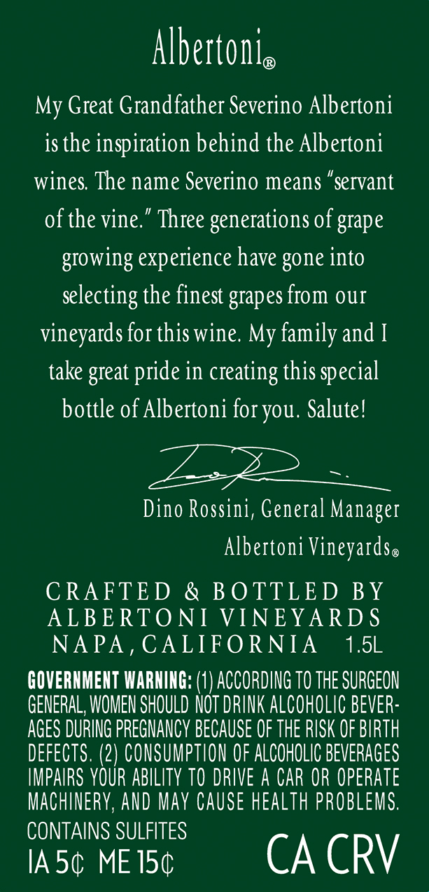 Product Name Albertoni Vineyards 2023 California Cabernet Sauvignon 750ml Display Name Albertoni Vineyards California Cabernet Sauvignon Red Wine Brand Albertoni Vineyards Item Code (Product ID) 01321623 Varietal Cabernet Sauvignon Vintage 2023 UPC 081054009003 SCC 10081054009000 Alcohol by Volume (ABV) 12.5 Appellation California Country of Origin UNITED STATES Sub Category RED Item Size 750ml Quantity Per Case 12 Bottle Diameter (Inches) 2.88 Bottle Height (Inches) 11.75 Weight of Filled Bottle (Lbs.) 2.5 Case Length (Inches) 12.5 Case Width (Inches) 10 Case Height (Inches) 12 Case Weight (Lbs.) 31.7 Distribution: Cases per Pallet 60 Distribution: Cases per Layer 15 Distribution: Layers per Pallet 4