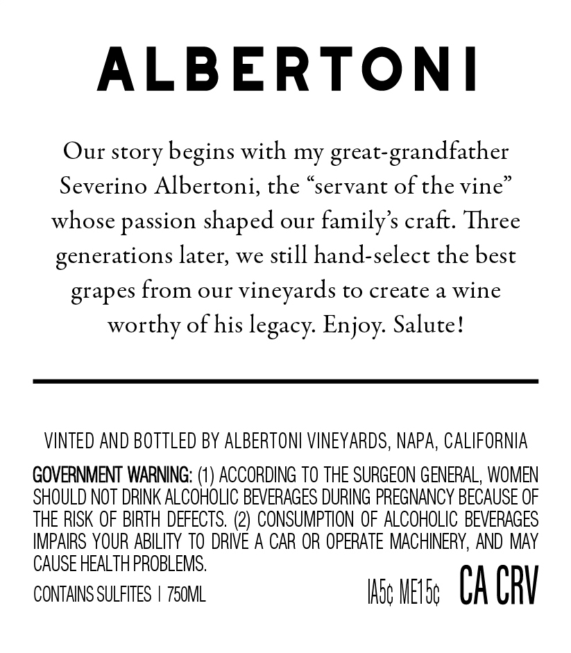 Product Name Albertoni Vineyards 2023 California Cabernet Sauvignon 750ml Display Name Albertoni Vineyards California Cabernet Sauvignon Red Wine Brand Albertoni Vineyards Item Code (Product ID) 01361023 Varietal Cabernet Sauvignon Vintage 2023 UPC 081054009003 SCC 10081054009000 Alcohol by Volume (ABV) 13.5 Appellation California Country of Origin UNITED STATES Sub Category RED Item Size 750ml Quantity Per Case 12 Bottle Diameter (Inches) 2.88 Bottle Height (Inches) 11.75 Weight of Filled Bottle (Lbs.) 2.5 Case Length (Inches) 12.5 Case Width (Inches) 10 Case Height (Inches) 12 Case Weight (Lbs.) 31.7 Distribution: Cases per Pallet 60 Distribution: Cases per Layer 15 Distribution: Layers per Pallet 4