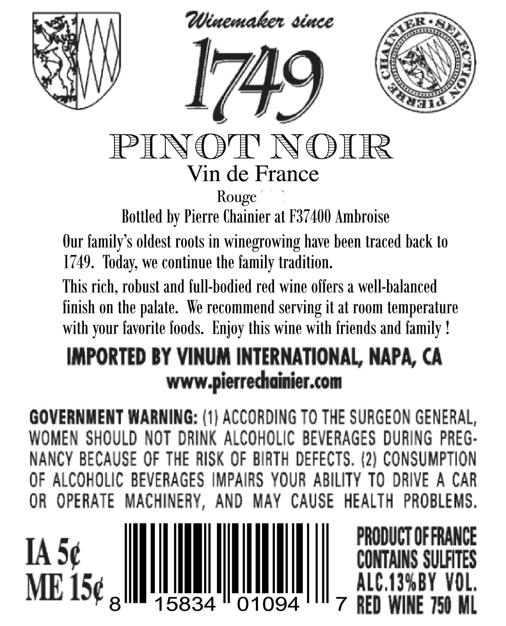 | Long Description | Welcome to Maison Pierre Chainier, a family-owned Loire Valley wine house with roots dating back to 1749. Based in historic Amboise along the Loire River, we unite generations of merchant expertise with estate winemaking excellence across our AOC vineyards in Touraine and Touraine Amboise. This 100% Pinot Noir reflects that heritage, offering a smooth, supple style bursting with juicy red berry flavors. Well balanced with subtle warm spice, it finishes soft yet fresh. Enjoy with grilled red meats, tomato-based pasta dishes, roasted poultry, or semi-soft cheeses, and experience the approachable elegance of the Grand Wines of the Loire. |