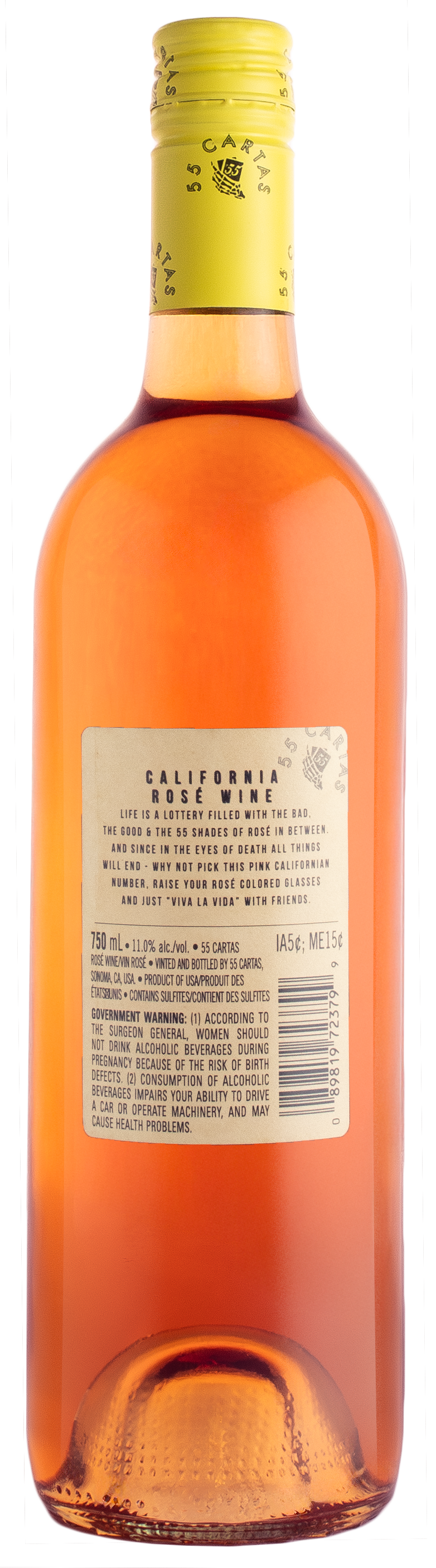 Product Name 55 Cartas NV California Rose Wine 750ml Display Name 55 Cartas California Rose Rose Wine Brand 55 Cartas Item Code (Product ID) 850102 Varietal Rose Vintage NV UPC 081054998024 SCC 10081054998021 Alcohol by Volume (ABV) 12.5 Appellation California Country of Origin AUSTRALIA Sub Category ROSE Item Size 750ml Quantity Per Case 12 Bottle Diameter (Inches) 2.94 Bottle Height (Inches) 11.88 Weight of Filled Bottle (Lbs.) 3 Case Length (Inches) 12.4 Case Width (Inches) 9.37 Case Height (Inches) 12.17 Case Weight (Lbs.) 33.8 Distribution: Cases per Pallet 60 Distribution: Cases per Layer 15 Distribution: Layers per Pallet 4