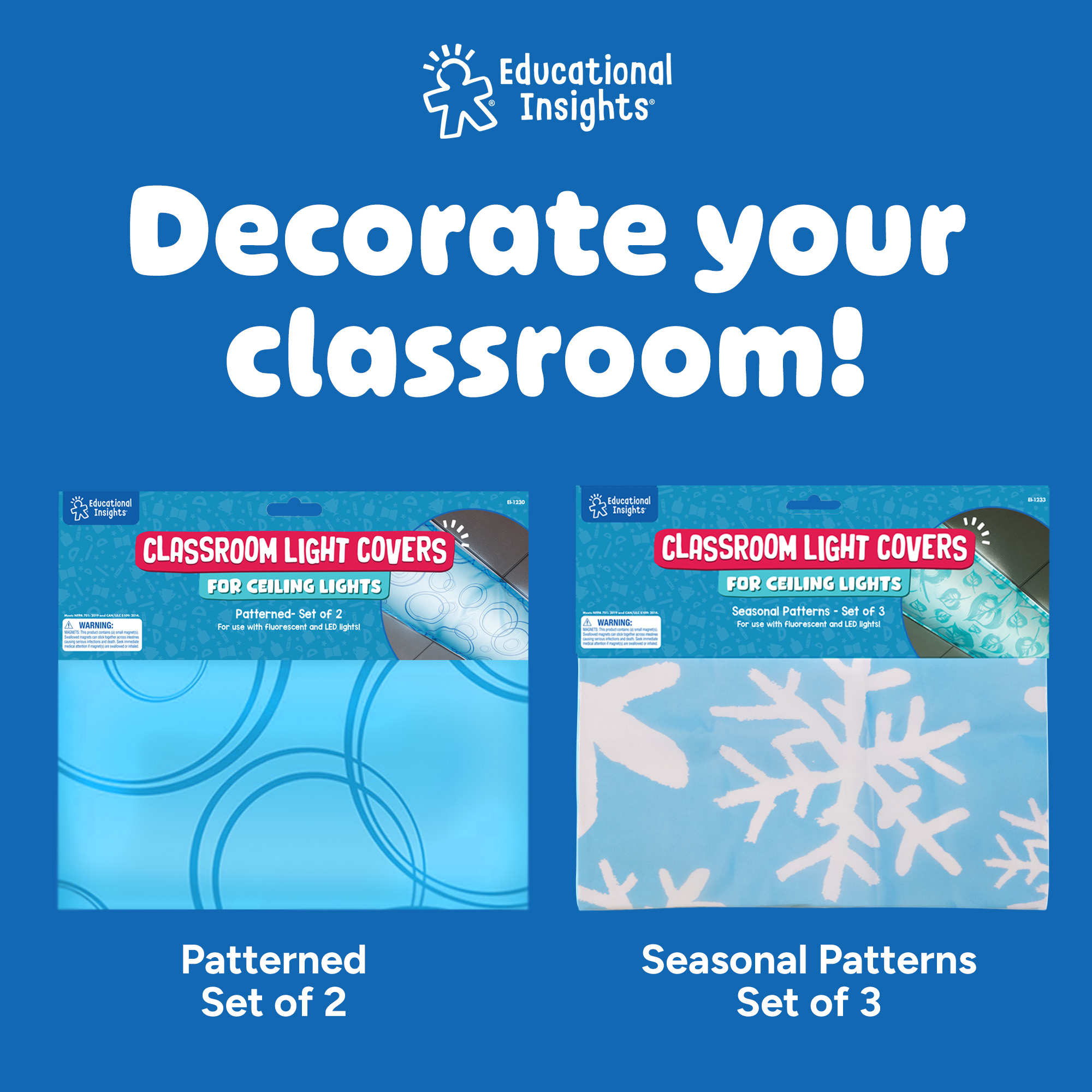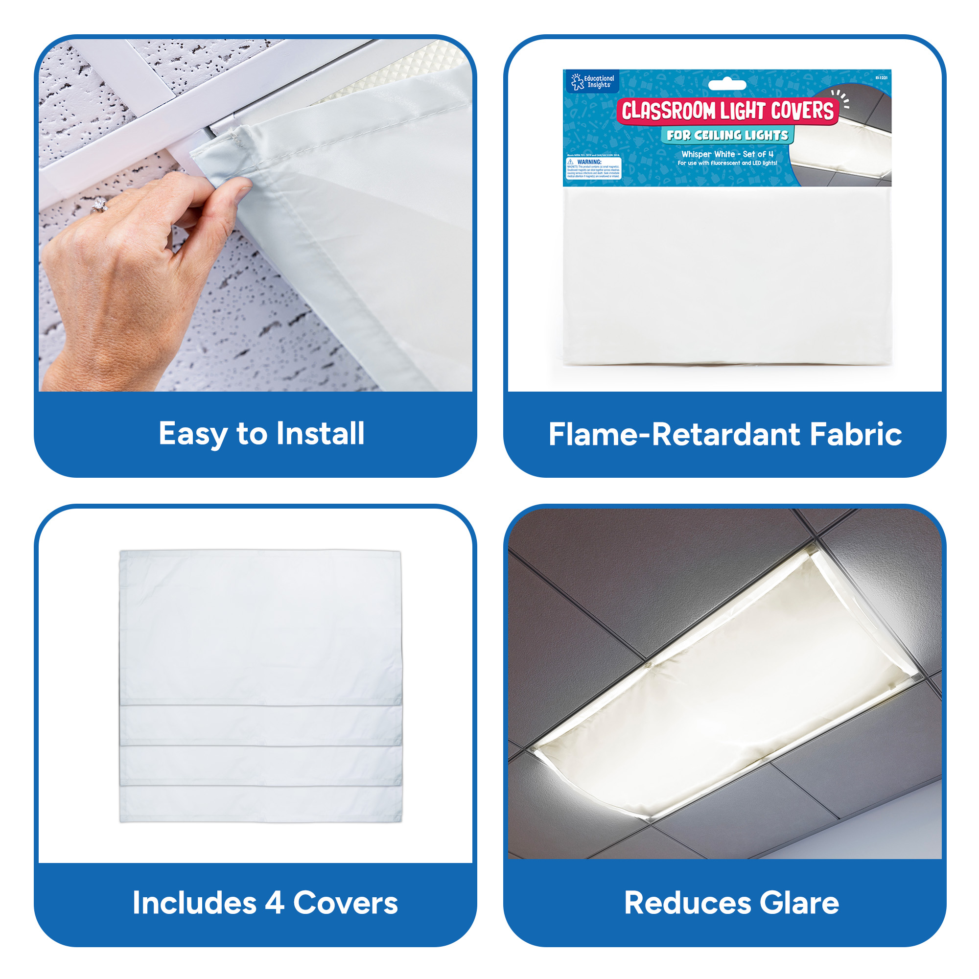SKU 1231 Product Title CLASSROOM LIGHT FILTERS WHISPER WHT ST/4 Brand Name Educational Insights UPC 086002012319 Piece Count 0 Min Target Age 0 Max Target Age 0 ProductCategoryProductLine Light Filters ProductCategorySubject Classroom Resources Port of Exit VNSGN Country of Origin VNM Unit Height 0.3 Unit Length 12.5 Unit Weight 0.9 Unit Width 0.7 Long Description - DC Fluorescent lights are a staple in classrooms, but their harsh glare and flickering light can cause eyestrain, headaches, and anxiety in students. Cover your classroom fluorescent lights with these fabric panels that fit over standard ceiling fixtures with sturdy, sewn-in magnets. Each set includes four 2' x 4' heat-resistant panels in Whisper White. For use with fluorescent lights only. CA prop 65 No Case Height 8.2 Case Length 25.5 Case Quantity 32 Case Weight 31.65 CPQ 1.82 Includes Remote No Marble Warning No MSRP 39.99 Small Ball Warning No Small Parts Warning No