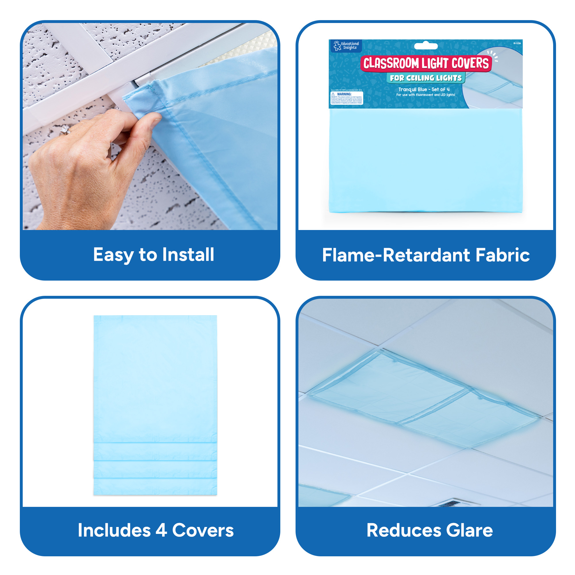 SKU 1236 Product Title SQUARE LIGHT FILTERS-TRANQUIL BLUE Brand Name Educational Insights UPC 086002012364 Piece Count 30 Min Target Age 7 Max Target Age 11 TargetGradeMax Sixth Grade TargetGradeMin Second Grade ProductCategoryProductLine Light Filters ProductCategorySubject Classroom Resources Port of Exit CNYTN Country of Origin CHN Unit Height 0.7 Unit Length 5.9 Unit Weight 0.6 Unit Width 12 Short Description - DC Fluorescent lights are a staple in classrooms and offices, but their harsh glare and flickering light can cause eyestrain, headaches, and anxiety. Cover your fluorescent and LED lights with these fabric panels that fit over standard ceiling fixtures with sturdy, sewn-in magnets. Each set includes four 2’ x 2’ heat-resistant panels in Tranquil Blue. For use with fluorescent and LED lights. Long Description - DC Fluorescent lights are a staple in classrooms and offices, but their harsh glare and flickering light can cause eyestrain, headaches, and anxiety. Cover your fluorescent and LED lights with these fabric panels that fit over standard ceiling fixtures with sturdy, sewn-in magnets. Each set includes four 2’ x 2’ heat-resistant panels in Tranquil Blue. For use with fluorescent and LED lights. CA prop 65 No Case Height 13.8 Case Length 13.8 Case Quantity 36 Case Weight 23.5 CPQ 1.45 Includes Remote No Marble Warning No MSRP 37.99 Small Ball Warning No Small Parts Warning No