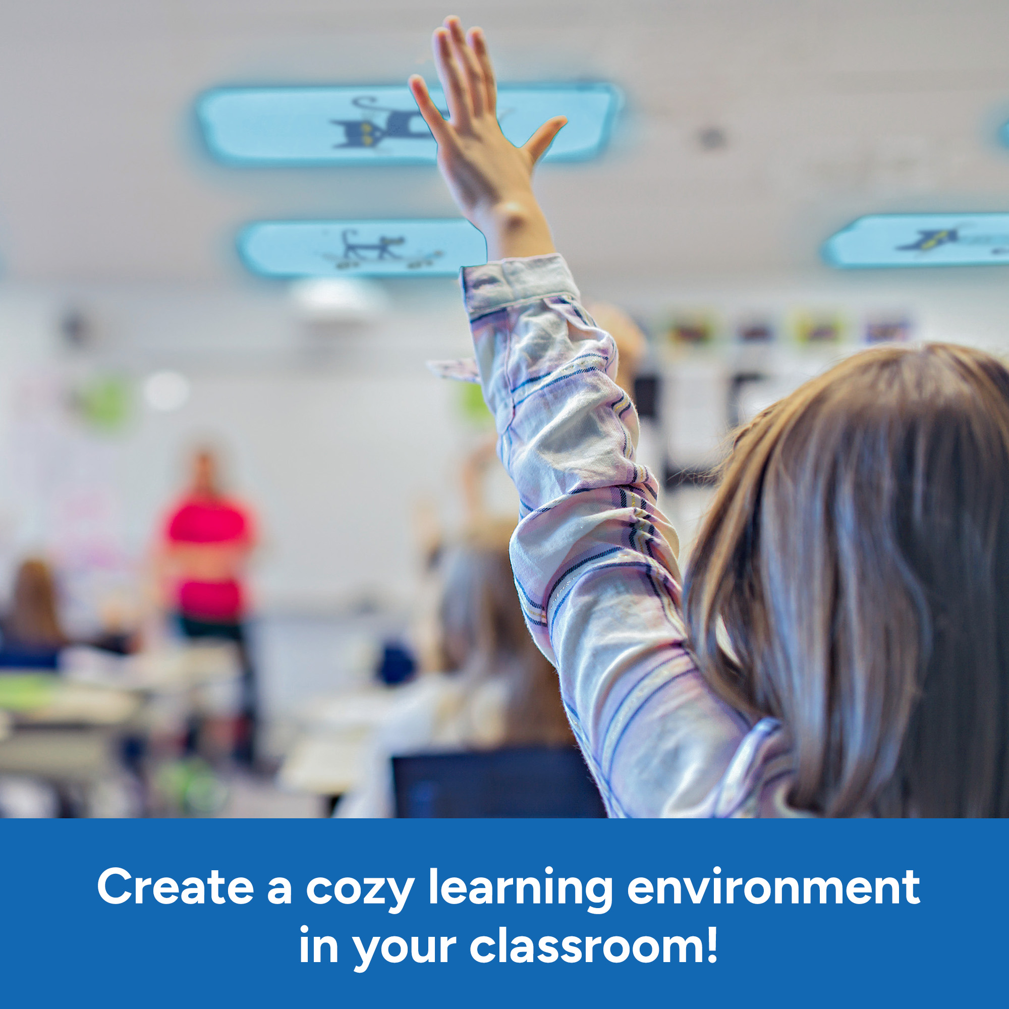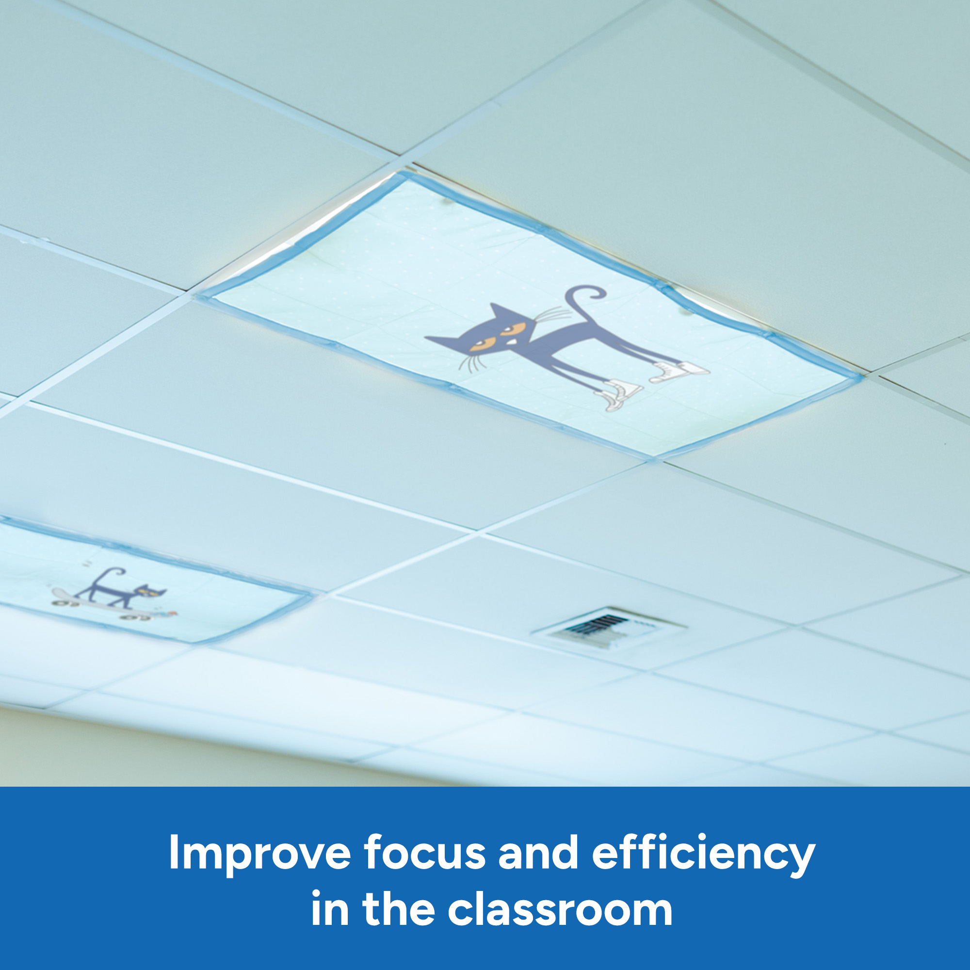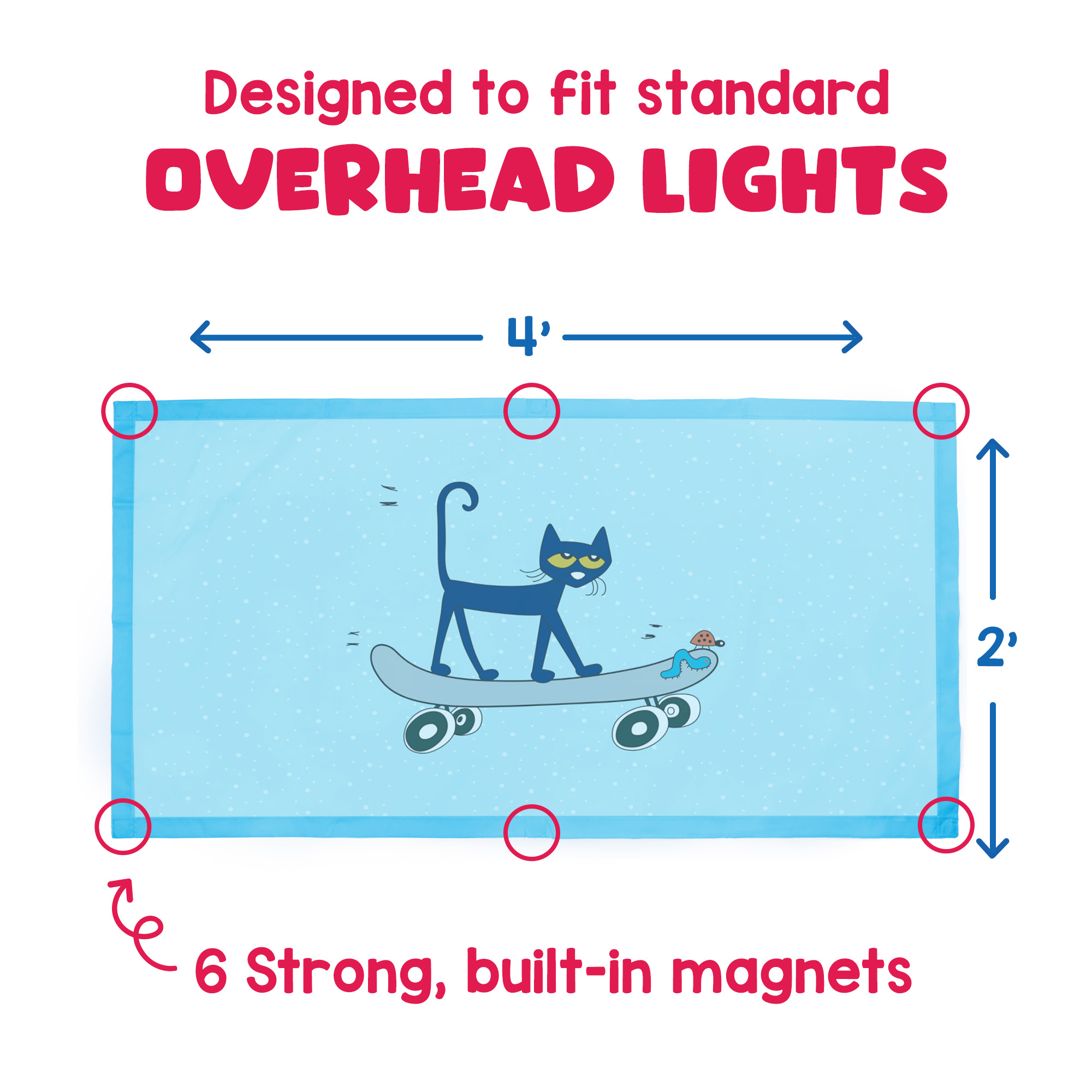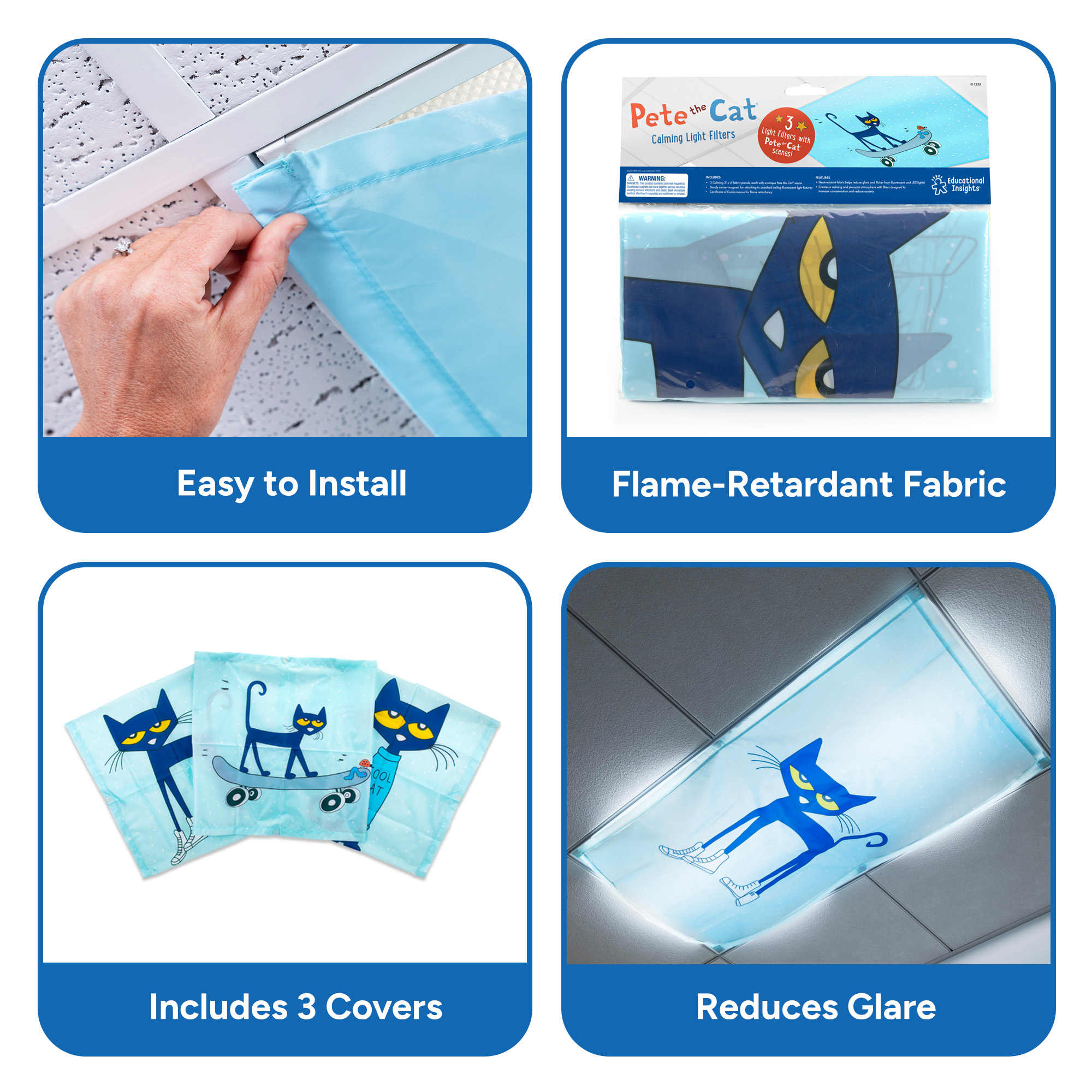 SKU 1238 Product Title PETE THE CAT CALMING LIGHT FILTERS Brand Name Educational Insights UPC 086002012388 Piece Count 0 Min Target Age 3 Max Target Age 4 TargetGradeMax Pre-K TargetGradeMin Toddler ProductCategoryProductLine Light Filters ProductCategorySubject Classroom Resources Port of Exit CNYTN Country of Origin CHN Unit Height 1.1 Unit Length 7 Unit Weight 0.65 Unit Width 12.3 Short Description - DC Cover your classroom lights with these fabric panels featuring super cool Pete the Cat school scenes and create a calm, cool, and groovy environment perfect for learning! Classroom Light Filters attach easily over standard ceiling fixtures with six sturdy, sewn-in magnets. Each set includes three 2’ x 4’ heat-resistant panels with three different Pete the Cat scenes. For use with fluorescent and LED lights only. Long Description - DC Fluorescent and LED lights are staples in the classroom, but their harsh glare and flickering light can cause eyestrain, headaches, and anxiety in students. Cover your classroom lights with these fabric panels featuring super cool Pete the Cat school scenes and create a calm, cool, and groovy environment perfect for learning! Classroom Light Filters attach easily over standard ceiling fixtures with six sturdy, sewn-in magnets. Each set includes three 2’ x 4’ heat-resistant panels with three different Pete the Cat school scenes in soothing shades of blue. For use with fluorescent and LED lights only. CA prop 65 No Case Height 5.4 Case Length 13.8 Case Quantity 12 Case Weight 9.3 CPQ 0.56 Includes Remote No Marble Warning No MSRP 44.99 Small Ball Warning No Small Parts Warning No