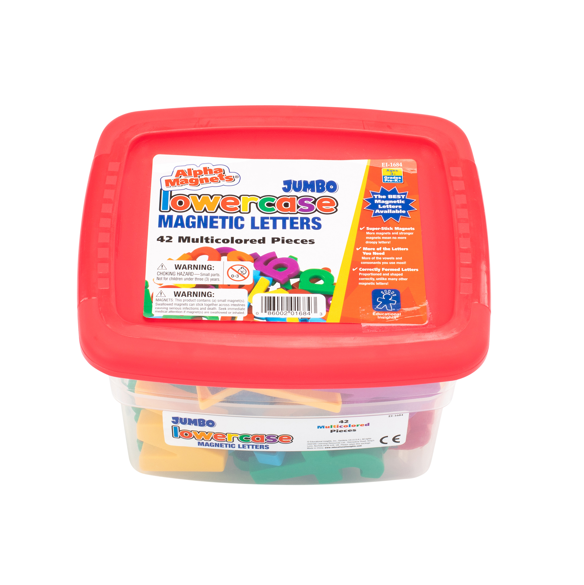 SKU 1684 Product Title JUMBO MULTICOLOR LOWERCASE ALPHAMAGNETS Brand Name Educational Insights UPC 086002016843 Piece Count 42 Min Target Age 3 Max Target Age 7 TargetGradeMax Second Grade TargetGradeMin Toddler ProductCategoryProductLine Magnets ProductCategorySubject Language & Letters Port of Exit CNNGB Country of Origin CHN Unit Height 5 Unit Length 7.6 Unit Weight 0.95 Unit Width 6.7 Long Description - DC Master letter names and sounds, and other phonics and early reading activities with AlphaMagnets Jumbo Lowercase Multicolored Magnets! This set of 42 magnets features extra-strong, no-slip magnets and letters formed the same way they're taught in school. Jumbo Lowercase Multicolored Magnets simply offer a more satisfying learning experience! CA prop 65 No Case Height 7.9 Case Length 28.3 Case Quantity 12 Case Weight 12.45 CPQ 1.76 Includes Remote No Marble Warning No MSRP 16.99 Small Ball Warning No Small Parts Warning No