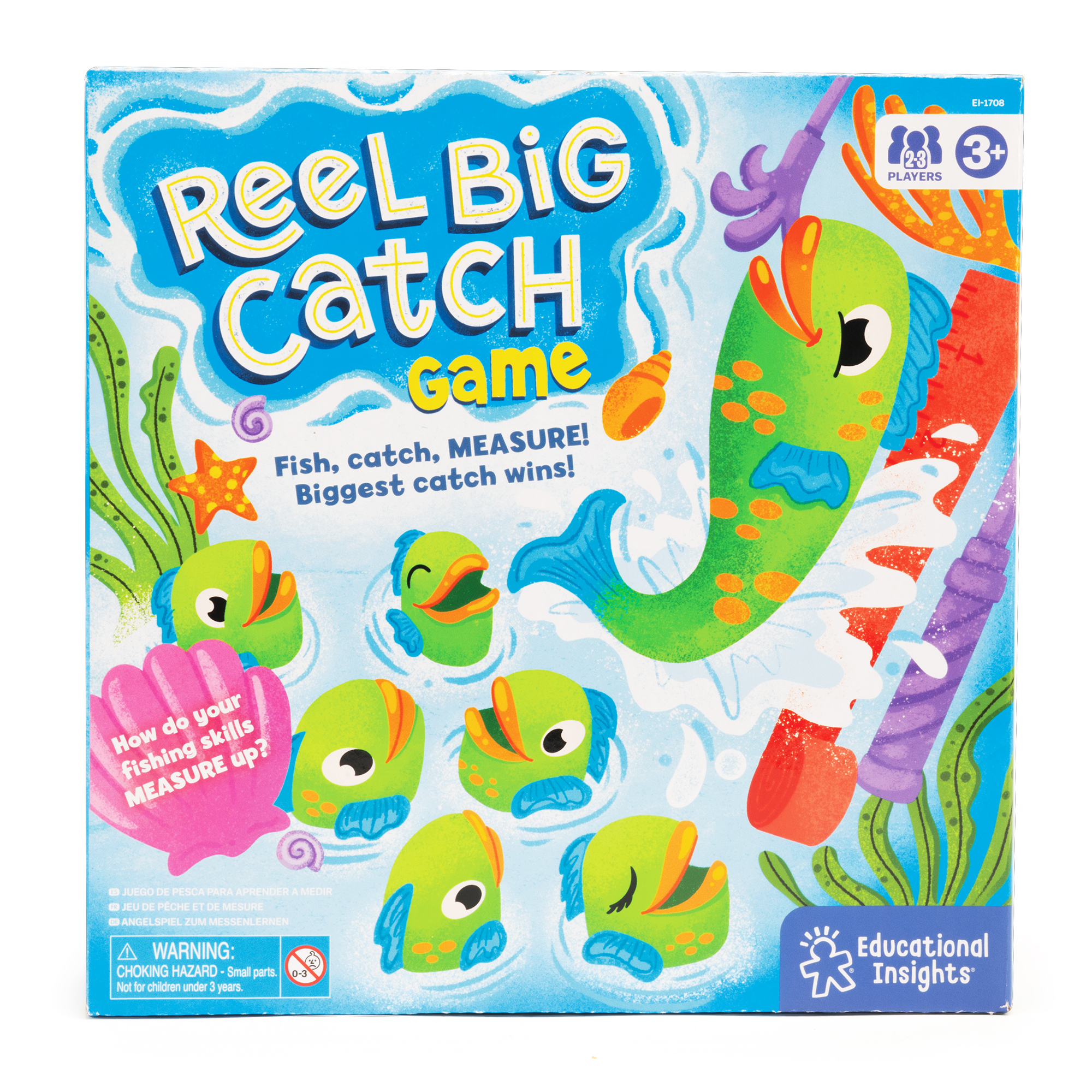 SKU 1708 Product Title Reel Big Catch Game Brand Name Educational Insights UPC 086002017086 Piece Count 17 Min Target Age 3 Max Target Age 6 TargetGradeMax First Grade TargetGradeMin Pre-K ProductCategoryProductLine Preschool Games ProductCategorySubject Games Port of Exit VNHPH Country of Origin VNM Unit Height 9.25 Unit Length 2.5 Unit Weight 0.8 Unit Width 9.12 Short Description - DC “School” your kids with this whopper of a game that’s fun for the whole family! Players use a fishing pole to “catch” telescoping fish and measure them against the included cards. Includes fishing pole, 12 fish, four measuring cards, and game guide. Long Description - DC “School” your kids with this whopper of a game that’s fun for the whole family! Players use a fishing pole to “catch” telescoping fish and measure them against the included cards. Includes fishing pole, 12 fish, four measuring cards, and game guide.