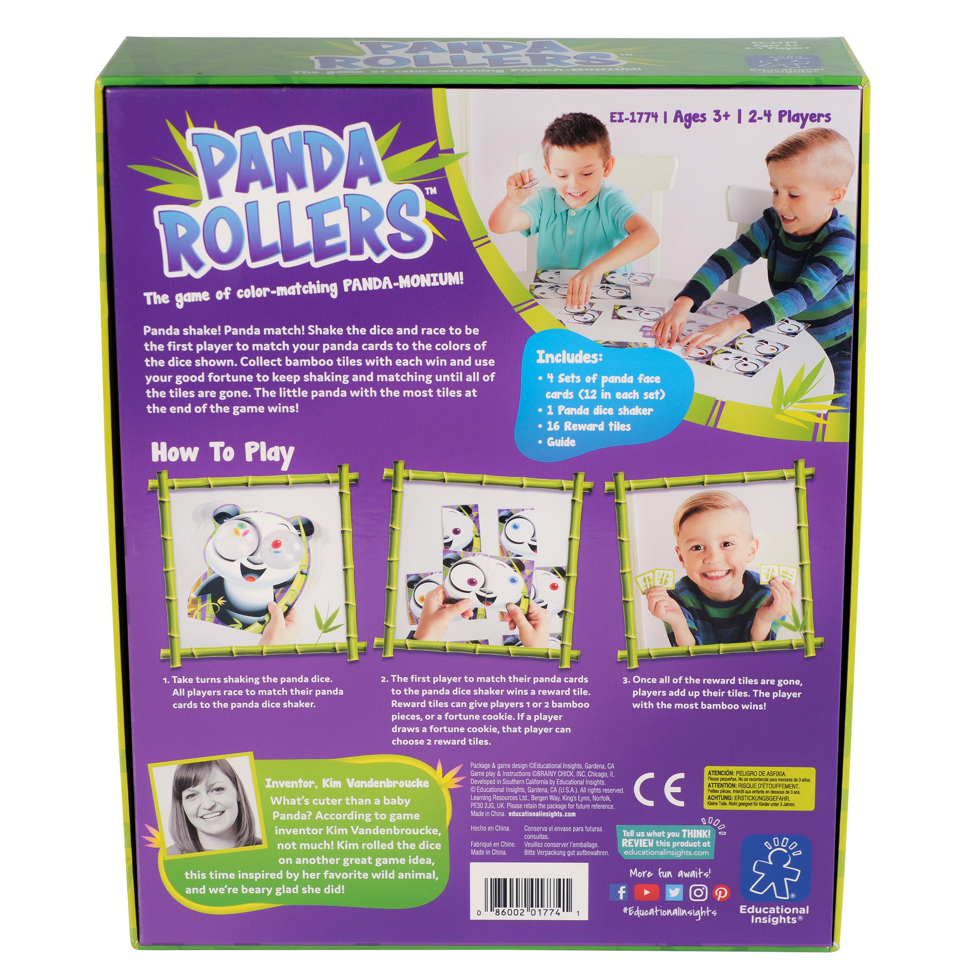 SKU 1774 Product Title PANDA ROLLERS GAME Brand Name Educational Insights UPC 086002017741 Piece Count 0 Min Target Age 3 Max Target Age 7 TargetGradeMax Second Grade TargetGradeMin Toddler ProductCategoryProductLine Preschool Games ProductCategorySubject Games Port of Exit CNYTN Country of Origin CHN Unit Height 3.4 Unit Length 10.1 Unit Weight 1 Unit Width 8.1 Long Description - DC Shake it up with Panda Rollers and be the first player to match your cards to the colors of the panda dice. Collect bamboo tiles with each win and use your good fortune to keep shaking and matching until all the tiles are gone. CA prop 65 No Case Height 9.2 Case Length 13 Case Quantity 4 Case Weight 4.85 CPQ 0.75 Includes Remote No Marble Warning No MSRP 27.99 Small Ball Warning No Small Parts Warning No