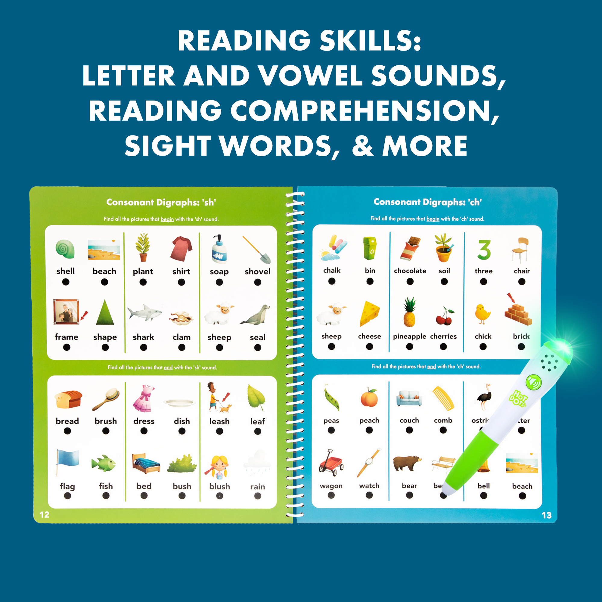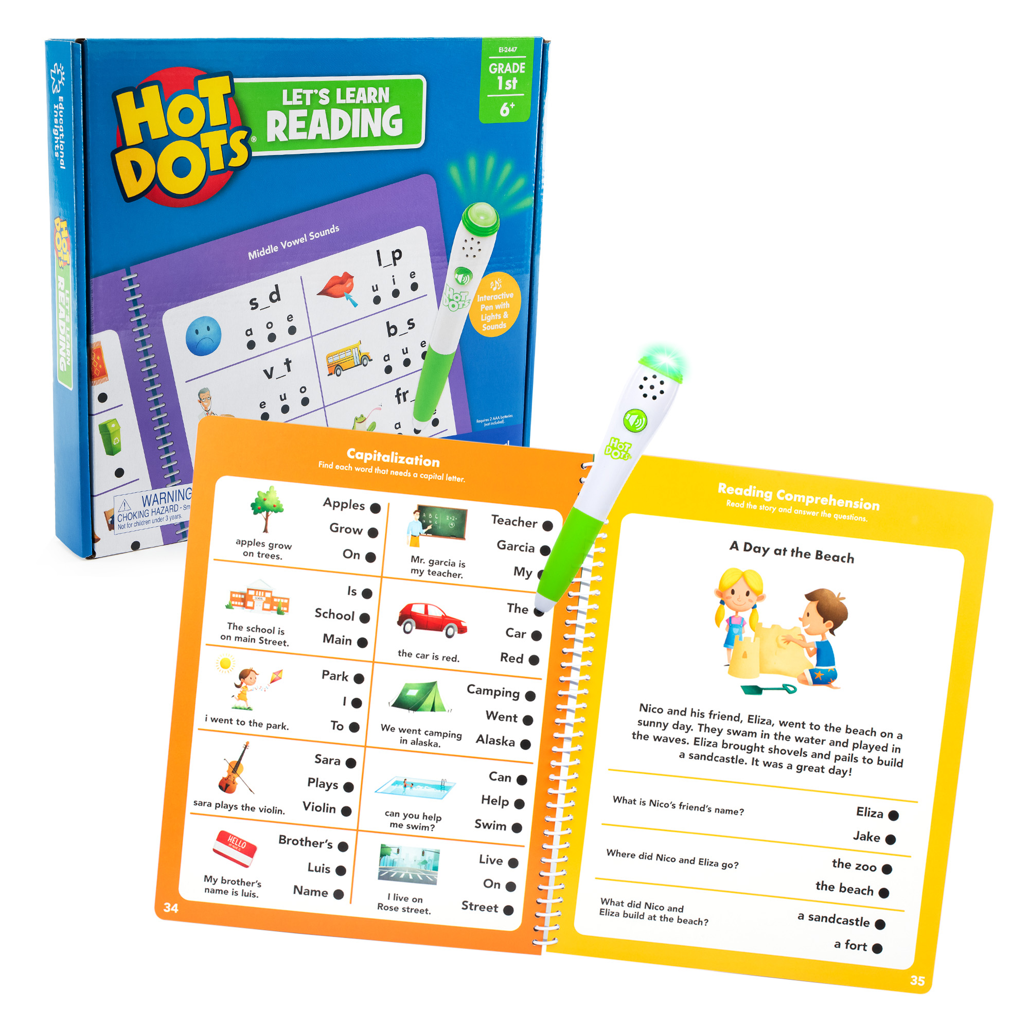 SKU 2447 Product Title Hot Dots Let's Learn Reading - 1st Grade Brand Name Educational Insights UPC 086002024473 Piece Count 0 Min Target Age 6 Max Target Age 7 TargetGradeMax Second Grade TargetGradeMin First Grade ProductCategoryProductLine Hot Dots ProductCategorySubject Workbooks & Kits Port of Exit CNYTN Country of Origin CHN Unit Height 10.5 Unit Length 1.5 Unit Weight 1.2 Unit Width 12 Long Description - DC Independent learning really hits the spot with Hot Dots Let’s Learn 1st Grade Reading! Designed specifically for 1st graders by educational experts, this set features an interactive, electronic Hot Dots pen with light and sound effects (and a mute button for quiet learning) and 50 pages of standards-based, foundational 1st grade reading activities. Kids review colorful, illustrated questions, then press the pen to any answer dot for instant, confidence-boosting feedback.