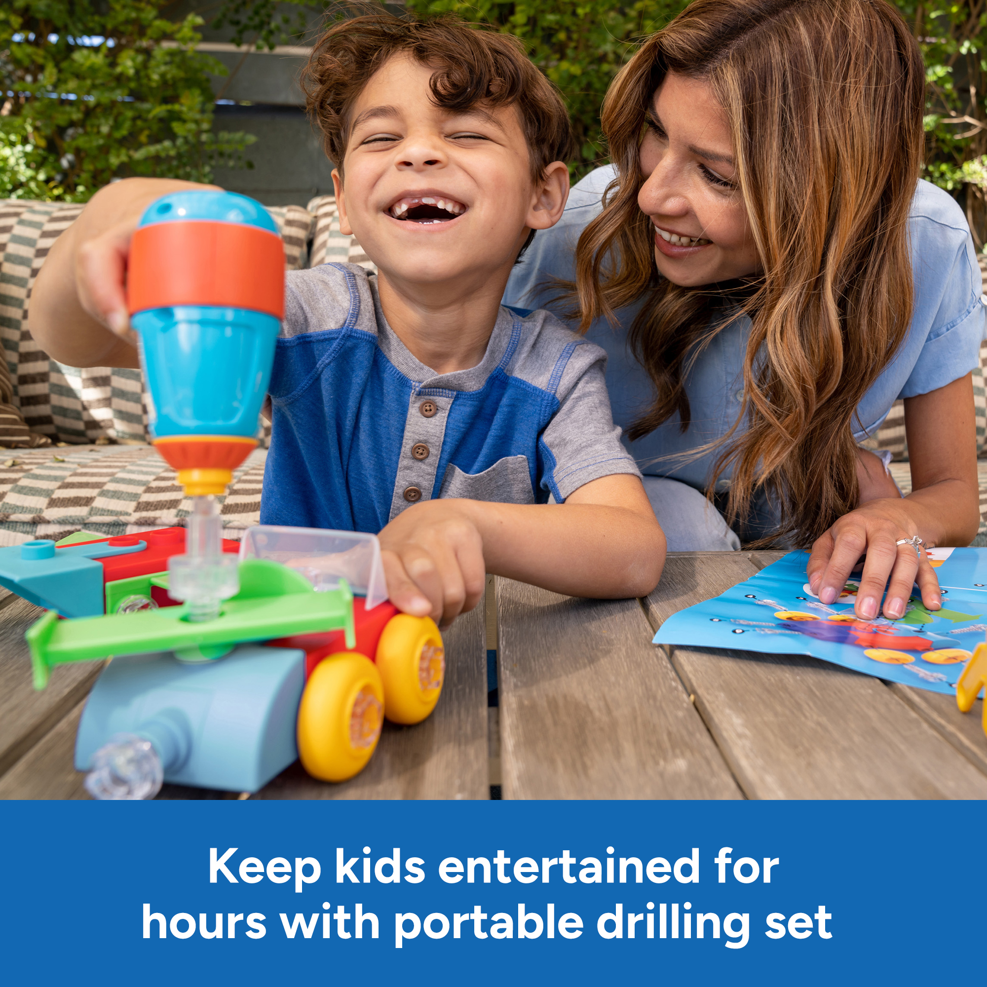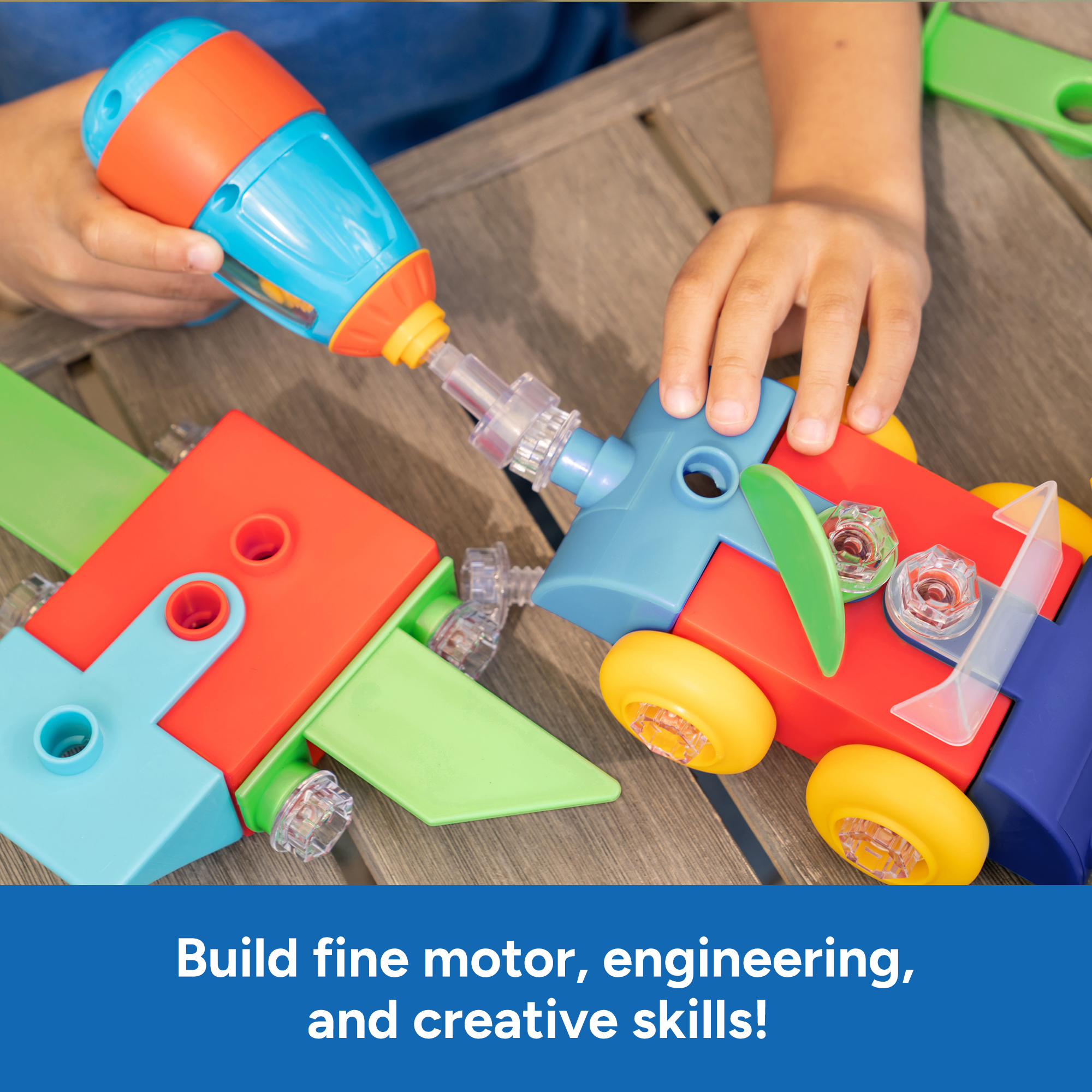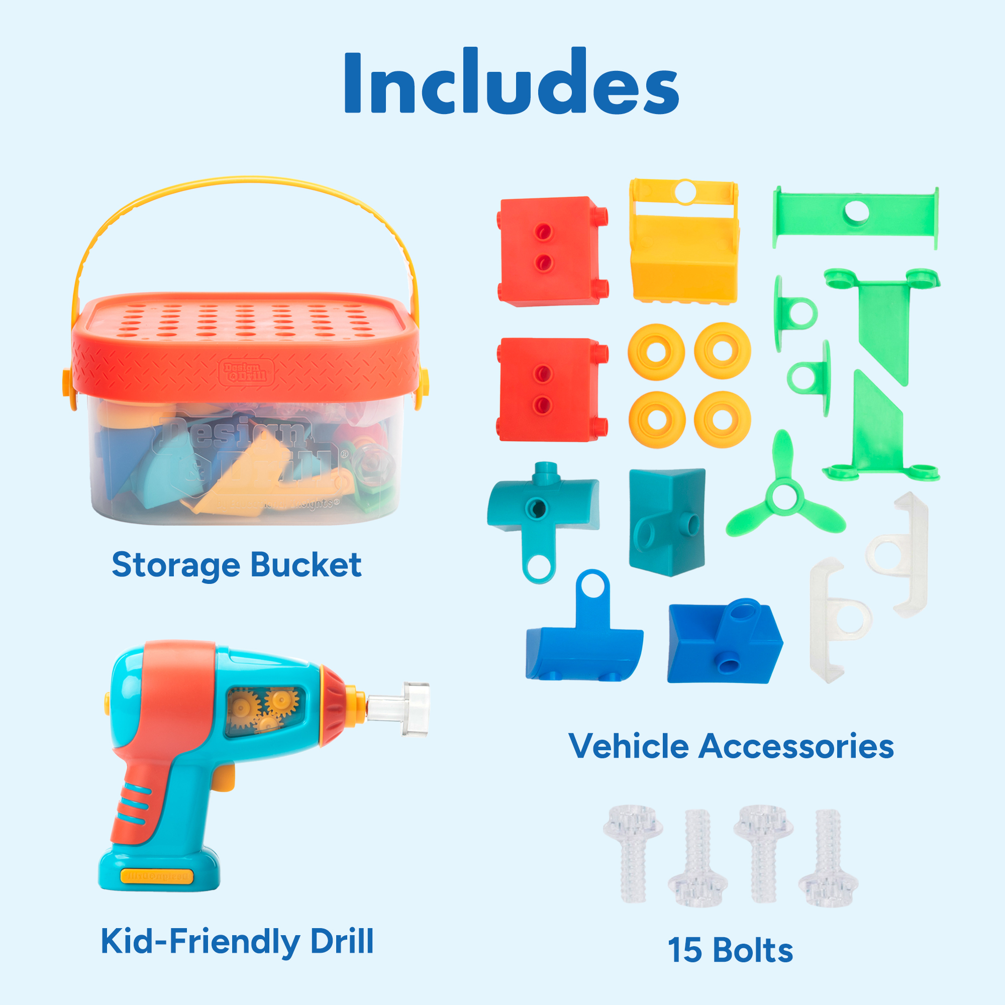 SKU 4146 Product Title DESIGN & DRILL BUILD-IT BUCKET Brand Name Educational Insights UPC 086002041463 Piece Count 41 Min Target Age 3 Max Target Age 7 TargetGradeMax Second Grade TargetGradeMin Toddler ProductCategoryProductLine Design & Drill ProductCategorySubject Engineering & Construction Port of Exit CNYTN Country of Origin CHN Unit Height 4.5 Unit Length 8.8 Unit Weight 2.05 Unit Width 8.8 Short Description - DC Race into construction play fun—and experience the thrill of the drill! —with a real, working power tool and 3D pieces kids can assemble to create the vehicles of their wildest dreams! Choose from a variety of parts and pieces, including vehicle parts, wheels, a propeller, and bulldozer scoop to build a car, airplane, bulldozer, helicopter, or crazy custom build. Then use the drill and colorful bolts to attach them in any configuration, driving home fine motor skills, creativity, early engineering, and STEM skills while you build. When you’re done, pack the pieces away in the storage container or take them with you for building fun-on-the-go! Long Description - DC With a real, working power tool and 3D pieces kids can assemble to create the vehicles of their wildest dreams! Choose from a variety of parts and pieces, including vehicle parts, wheels, a propeller, and a bulldozer scoop to build a car, airplane, bulldozer, helicopter, or a crazy custom build. Then use the drill and colorful bolts to attach them in any configuration, driving home fine motor skills, creativity, early engineering, and STEM skills while you build. When you’re done, pack the pieces away in the storage container or take them with you for building fun on the go!