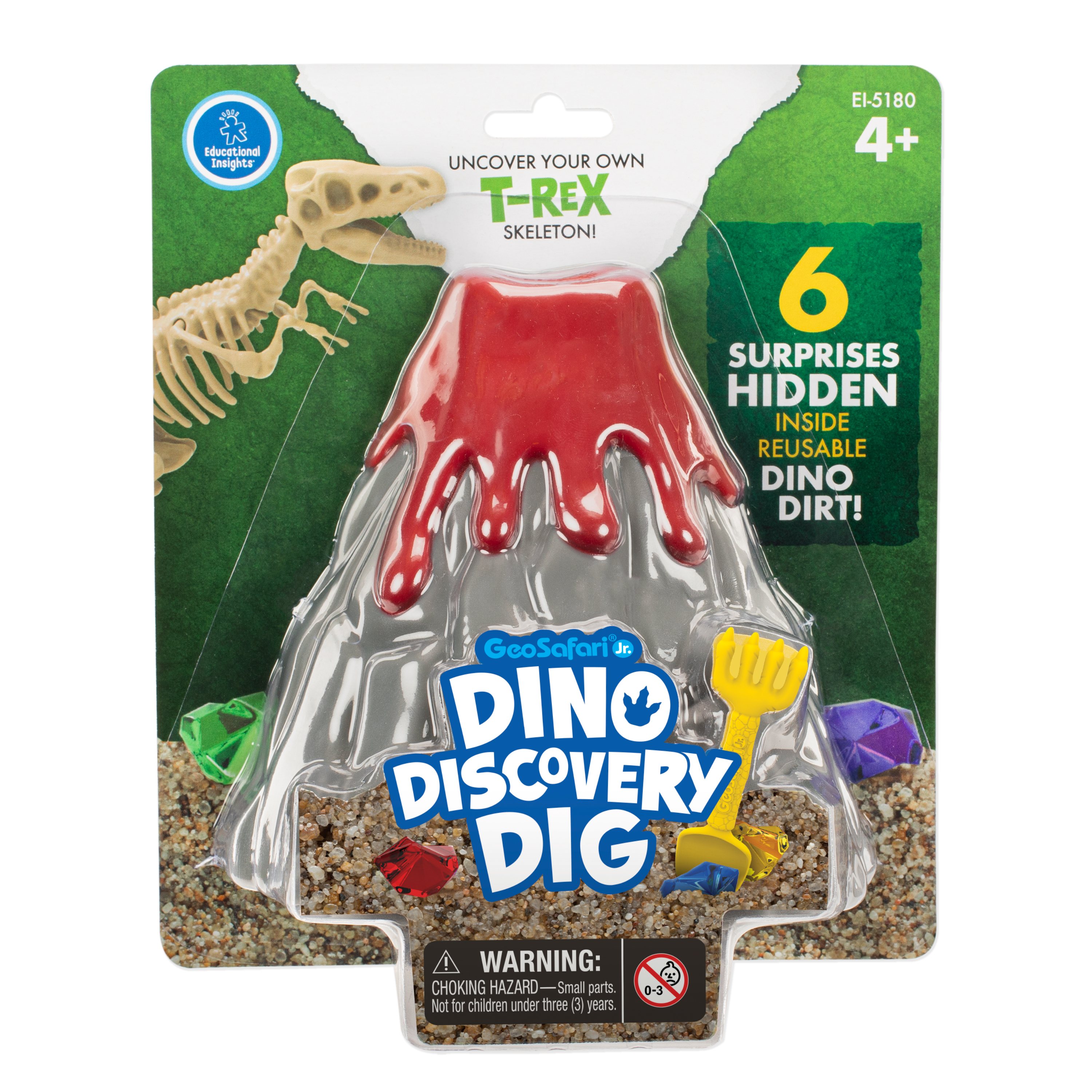 SKU 5180 Product Title GeoSafari® Jr. Dino Discovery Dig T-Rex Brand Name Educational Insights UPC 086002051806 Piece Count 0 Min Target Age 4 Max Target Age 8 TargetGradeMax Third Grade TargetGradeMin Pre-K ProductCategoryProductLine GeoSafari ProductCategorySubject Science/STEM Port of Exit CNYTN Country of Origin CHN Unit Height 2.9 Unit Length 7.4 Unit Weight 1.1 Unit Width 6.5 Short Description - DC Roar into prehistoric pretend play and use your dino-might discovery skills to dig out hidden surprises with GeoSafari Jr. Dino Discovery Dig! Excavate bones from the reusable dino dirt to construct a display-worthy dinosaur skeleton—just like a real paleontologist! Includes reusable dino dirt, digging tool, dino bones, volcano case with fossil molds, mystery gem, and dino fact card. Dino dirt is reusable for endless hours of dino digging and fun, and with two different dinosaurs to collect, prehistoric play time never ends! Long Description - DC Roar into prehistoric pretend play and use your dino-might discovery skills to dig out hidden surprises with GeoSafari Jr. Dino Discovery Dig! Excavate bones from the reusable dino dirt to construct a display-worthy dinosaur skeleton—just like a real paleontologist! Includes reusable dino dirt, digging tool, dino bones, volcano case with fossil molds, mystery gem, and dino fact card. Dino dirt is reusable for endless hours of dino digging and fun, and with two different dinosaurs to collect, prehistoric play time never ends! CA prop 65 No Case Height 8.3 Case Length 11.3 Case Quantity 6 Case Weight 7.6 CPQ 0.39 Includes Remote No Marble Warning No MSRP 16.99 Small Ball Warning No Small Parts Warning Yes
