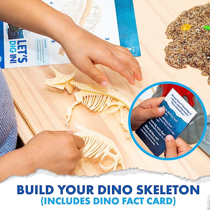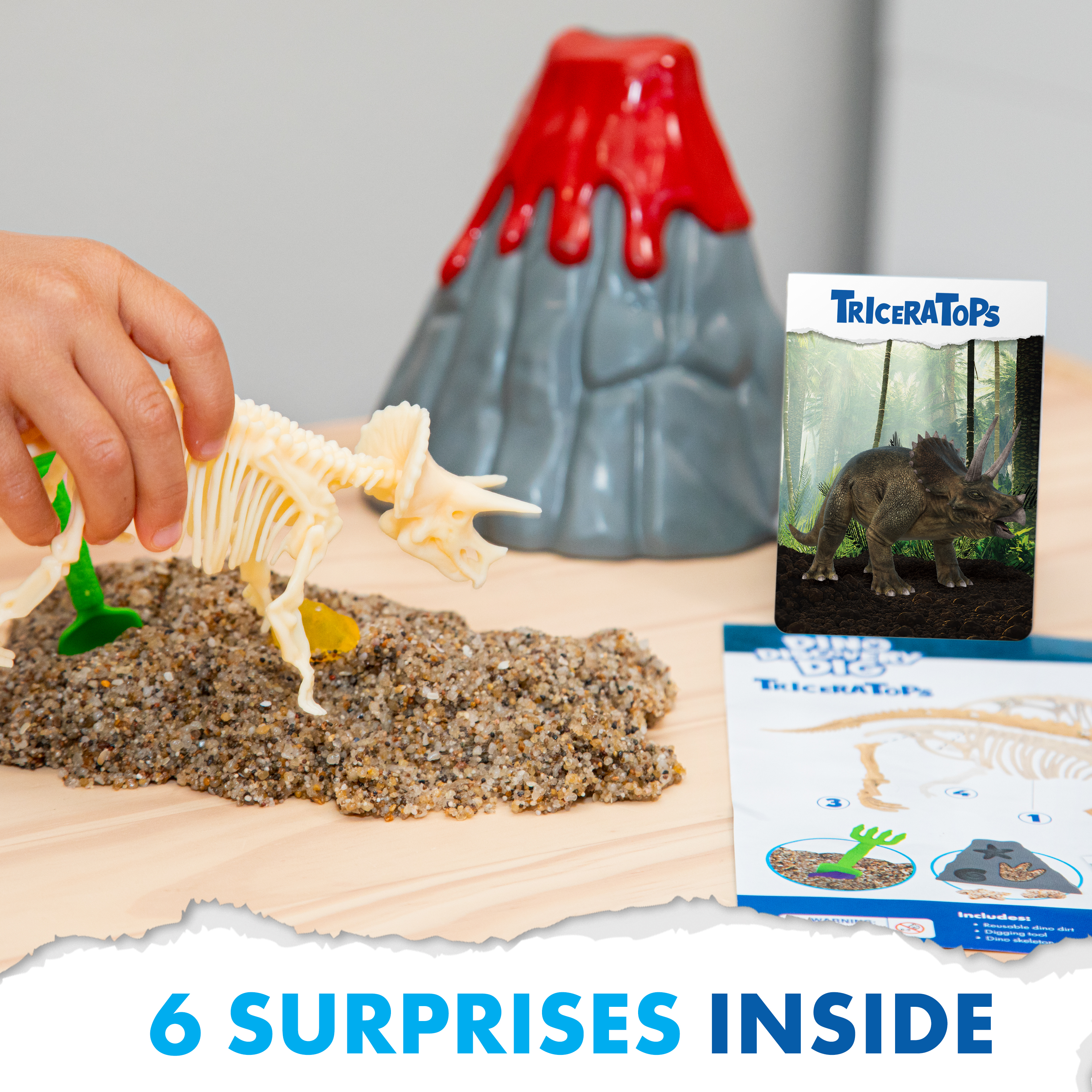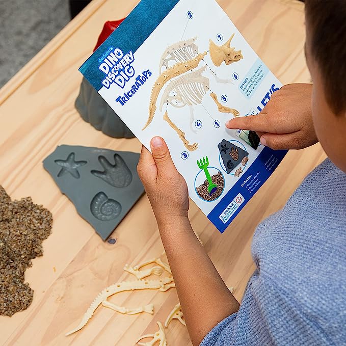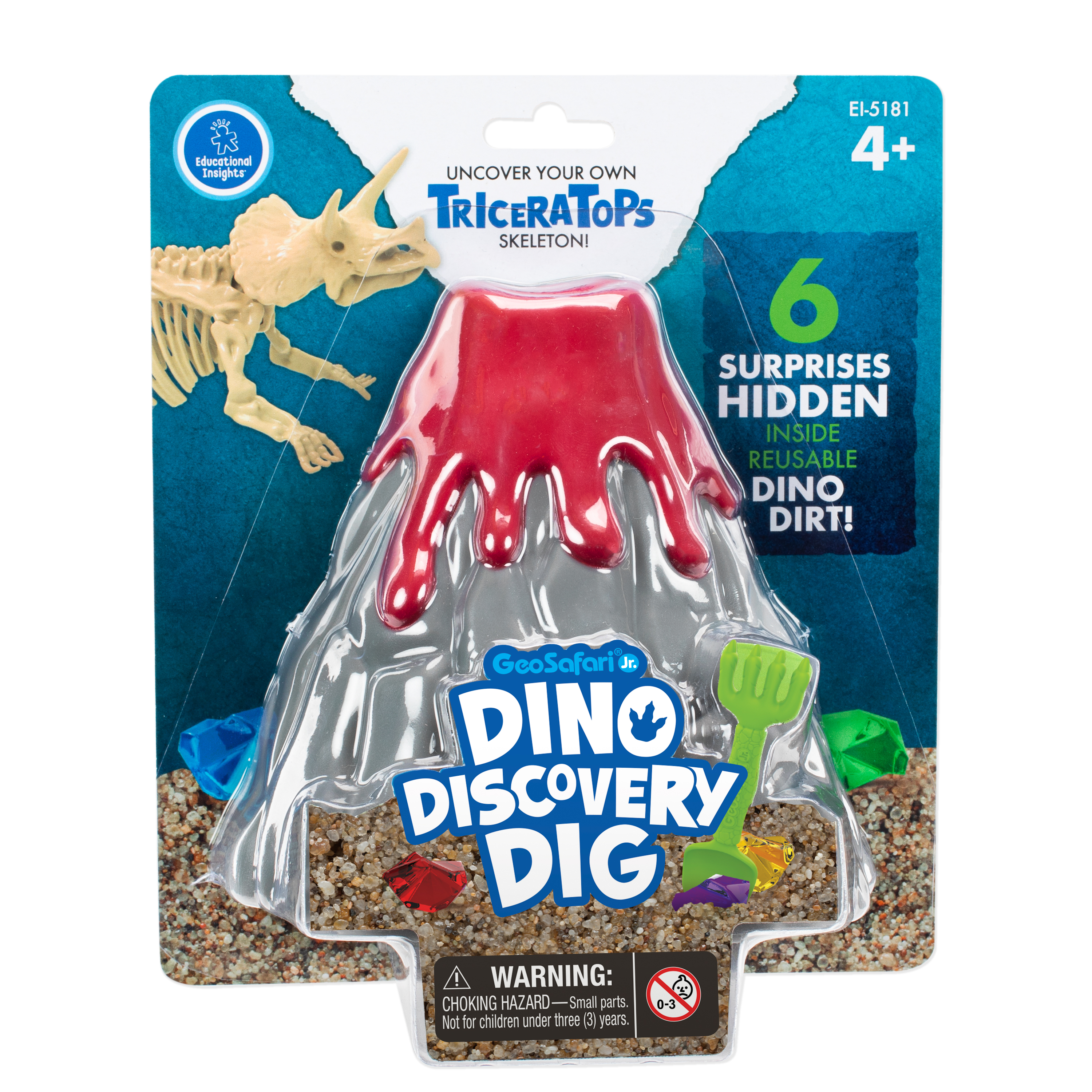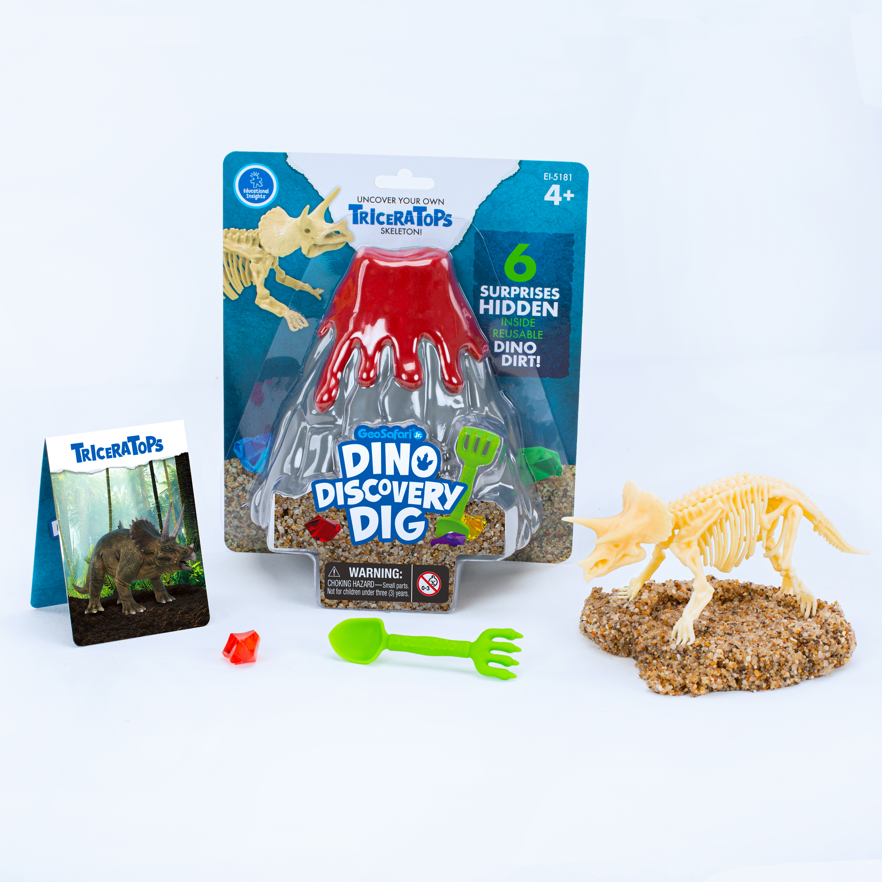 SKU 5181 Product Title GeoSafari® Jr. Dino Discovery Dig Triceratops Brand Name Educational Insights UPC 086002051813 Piece Count 0 Min Target Age 4 Max Target Age 8 TargetGradeMax Third Grade TargetGradeMin Pre-K ProductCategoryProductLine GeoSafari ProductCategorySubject Science/STEM Port of Exit CNYTN Country of Origin CHN Unit Height 2.9 Unit Length 7.4 Unit Weight 1.2 Unit Width 6.4 Short Description - DC Roar into prehistoric pretend play and use your dino-might discovery skills to dig out hidden surprises with GeoSafari Jr. Dino Discovery Dig! Excavate bones from the reusable dino dirt to construct a display-worthy dinosaur skeleton—just like a real paleontologist! Includes reusable dino dirt, digging tool, dino bones, volcano case with fossil molds, mystery gem, and dino fact card. Dino dirt is reusable for endless hours of dino digging and fun, and with two different dinosaurs to collect, prehistoric play time never ends! Long Description - DC Roar into prehistoric pretend play and use your dino-might discovery skills to dig out hidden surprises with GeoSafari Jr. Dino Discovery Dig! Excavate bones from the reusable dino dirt to construct a display-worthy dinosaur skeleton—just like a real paleontologist! Includes reusable dino dirt, digging tool, dino bones, volcano case with fossil molds, mystery gem, and dino fact card. Dino dirt is reusable for endless hours of dino digging and fun, and with two different dinosaurs to collect, prehistoric play time never ends! CA prop 65 No Case Height 8.3 Case Length 11.2 Case Quantity 6 Case Weight 7.65 CPQ 0.39 Includes Remote No Marble Warning No MSRP 16.99 Small Ball Warning No Small Parts Warning Yes