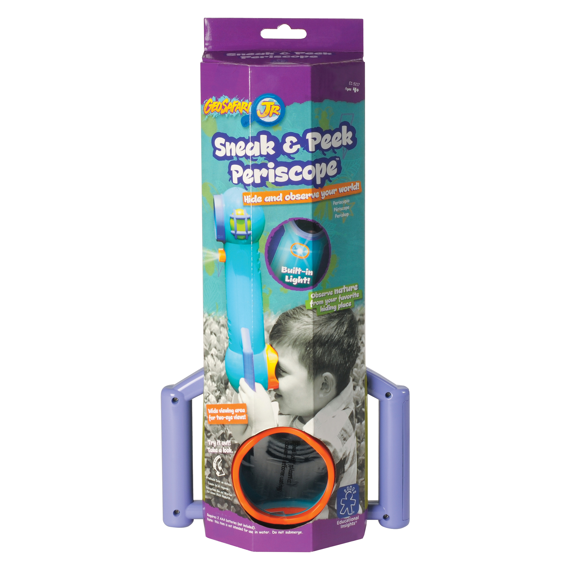 SKU 5217 Product Title SNEAK & PEEK PERISCOPE Brand Name Educational Insights UPC 086002052179 Piece Count 0 Min Target Age 4 Max Target Age 8 TargetGradeMax Third Grade TargetGradeMin Pre-K ProductCategoryProductLine GeoSafari ProductCategorySubject Science/STEM Port of Exit CNYTN Country of Origin CHN Unit Height 4.5 Unit Length 14.2 Unit Weight 1.1 Unit Width 7.4 Long Description - DC Scope out nature with the GeoSafari Jr. Sneak & Peek Periscope! Built just for kids, this sneaky tool lets you spy on nature from your secret hideout without ever moving! There's even a light for scoping in the dark. The Sneak & Peek Periscope requires 2 AAA batteries (not included). CA prop 65 Yes Case Height 15.8 Case Length 15 Case Quantity 6 Case Weight 9.6 CPQ 2.21 Includes Remote No Marble Warning No MSRP 23.99 Small Ball Warning No Small Parts Warning Yes