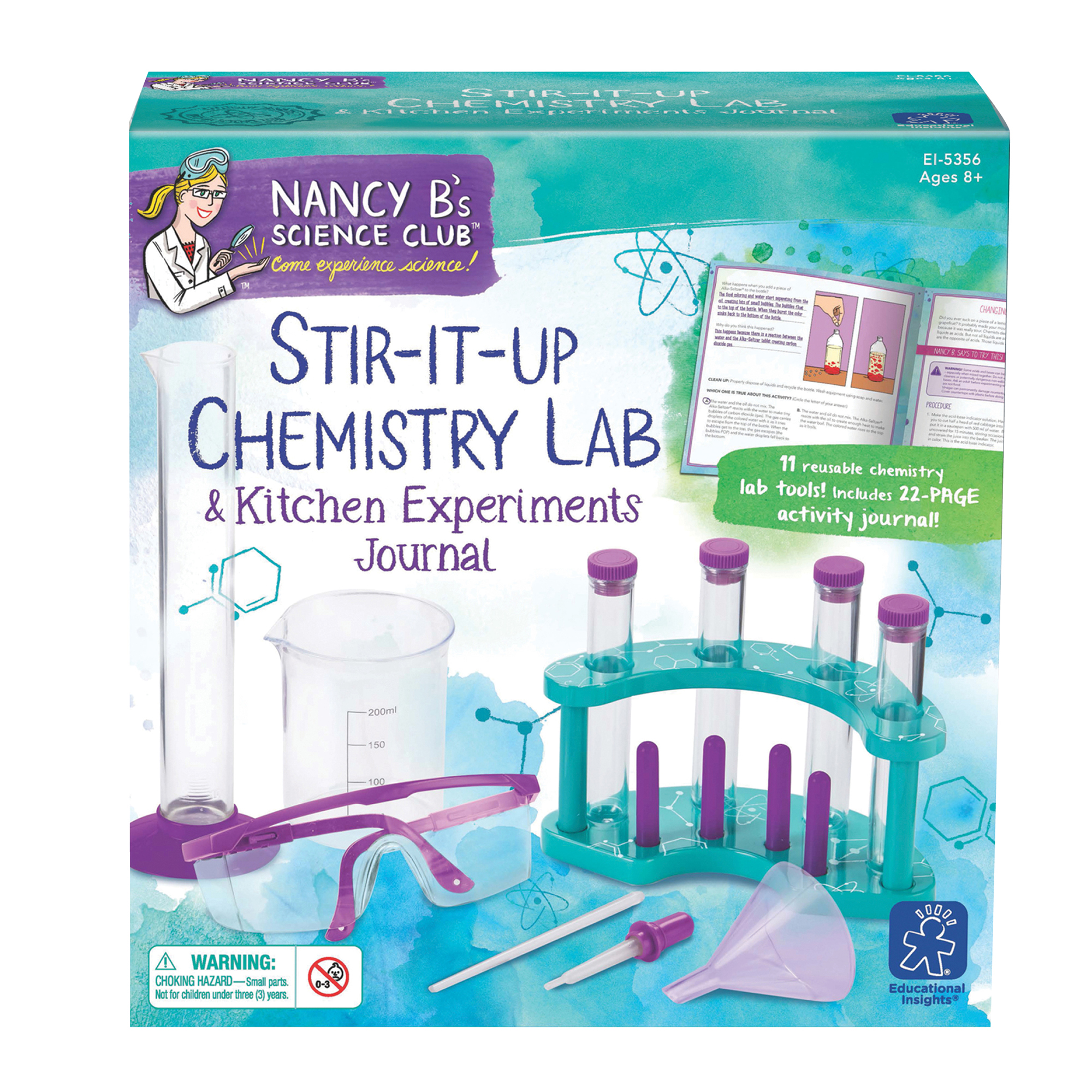 SKU 5356 Product Title NANCYBSTIR-IT-UP CHEMISTRY LAB & JOURNAL Brand Name Educational Insights UPC 086002053565 Piece Count 0 Min Target Age 8 Max Target Age 12 TargetGradeMax Seventh Grade TargetGradeMin Third Grade ProductCategoryProductLine Nancy B ProductCategorySubject Science/STEM Port of Exit CNYTN Country of Origin CHN Unit Height 4.6 Unit Length 9.1 Unit Weight 0.95 Unit Width 8.8 Long Description - DC Perform some cool chemistry experiments in your kitchen with the Nancy B. Chemistry Set! Non-consumable, basic chemistry set enables junior chemists to safely explore simple science principles. Extinguish a flame by pouring an invisible gas on it; make your own bubbling 'lava' in a bottle; cause chemicals to change color - and more - all while learning basic chemical principals. Set includes essential lab equipment including: beaker, test tubes, goggles, and more. Journal is filled with experiments utilizing common household ingredients PLUS opportunities for young scientists to write, draw, and think about their discoveries. Perfect for STEM learning. Ages 8+. CA prop 65 No Case Height 9.5 Case Length 19.1 Case Quantity 6 Case Weight 7.2 CPQ 1.46 Includes Remote No Marble Warning No MSRP 29.99 Small Ball Warning No Small Parts Warning No
