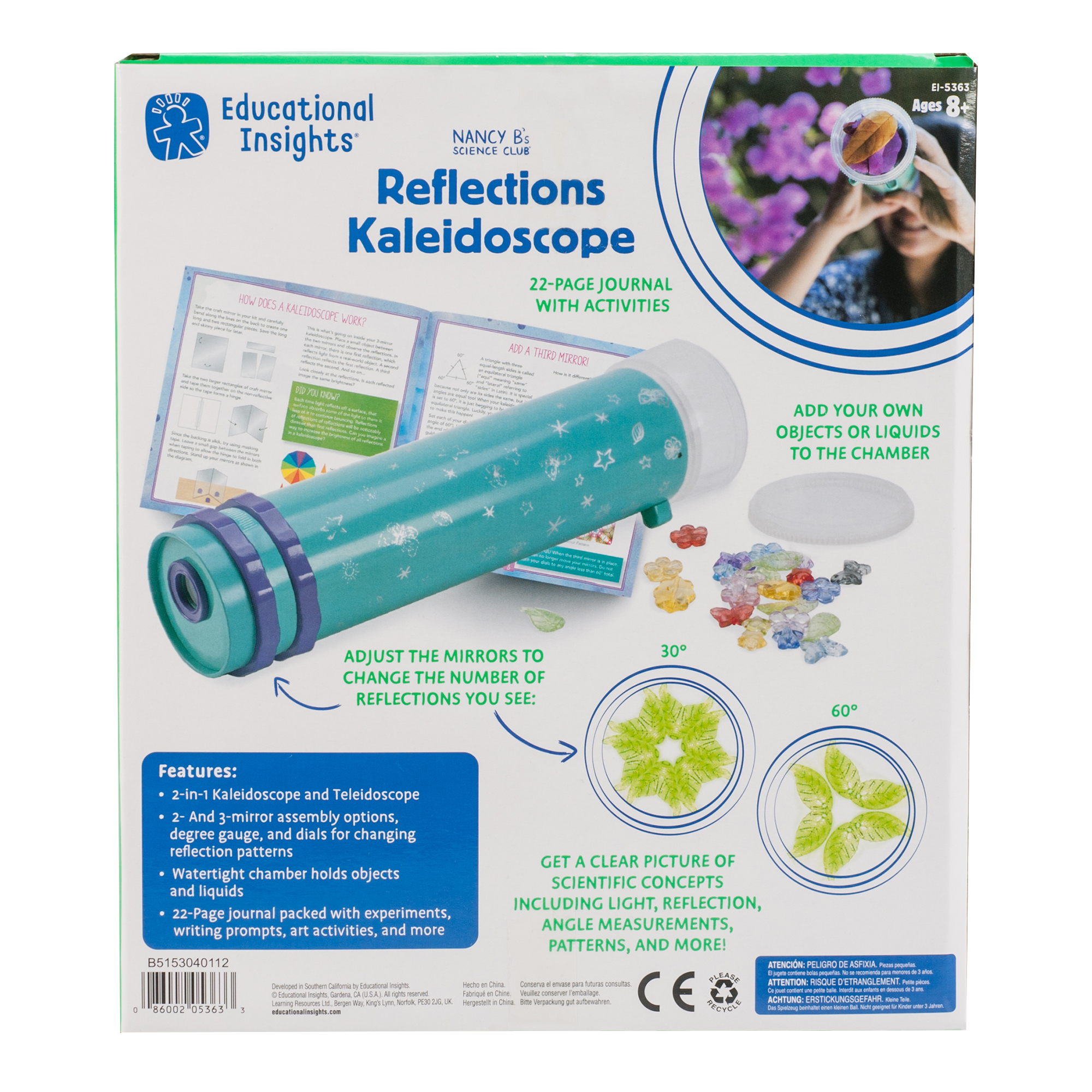 SKU 5363 Product Name Nancy B Kaleidoscope Product Title NANCY B'S REFLECTIONS KALEIDOSCOPE Brand Name Educational Insights UPC 086002053633 Piece Count 0 Min Target Age 8 Max Target Age 12 TargetGradeMax Seventh Grade TargetGradeMin Third Grade ProductCategoryProductLine Nancy B ProductCategorySubject Science/STEM Port of Exit CNYTN Country of Origin CHN Unit Height 3 Unit Length 10.4 Unit Weight 1.2 Unit Width 9.2 Long Description - DC Discover the beauty of light with the Reflections Kaleidoscope! Adjust the mirrors to change the patterns you see, add your own objects to the water-tight chamber to create new patterns, or remove the chamber to view the world with a brilliant, kaleidoscope effect! CA prop 65 No Case Height 10.8 Case Length 19.2 Case Quantity 12 Case Weight 16.25 CPQ 2.33 Includes Remote No Marble Warning No MSRP 27.99 Small Ball Warning Yes Small Parts Warning Yes