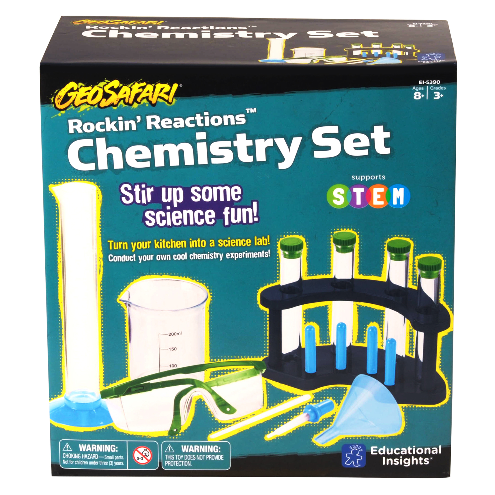 SKU 5390 Product Title GEOSAFARI ROCKIN' REACTIONS CHEMISTRY Brand Name Educational Insights UPC 086002053909 Piece Count 0 Min Target Age 8 Max Target Age 12 TargetGradeMax Seventh Grade TargetGradeMin Third Grade ProductCategoryProductLine GeoSafari ProductCategorySubject Science/STEM Port of Exit CNYTN Country of Origin CHN Unit Height 4.5 Unit Length 9.25 Unit Weight 1 Unit Width 8.8 Long Description - DC Kids use real, scientific tools to conduct cool chemistry experiments—at home—with the GeoSafari Rockin' Reactions Chemistry Set! Includes 11 tools and 22-page activity guide with step-by-step instructions. Promote STEM learning with the Rockin' Reactions Chemistry Set! CA prop 65 No Case Height 9.5 Case Length 19.3 Case Quantity 6 Case Weight 7.05 CPQ 1.47 Includes Remote No Marble Warning No MSRP 29.99 Small Ball Warning No Small Parts Warning No