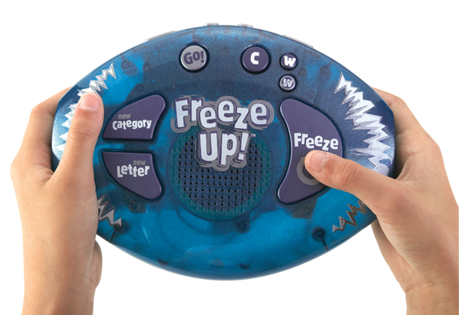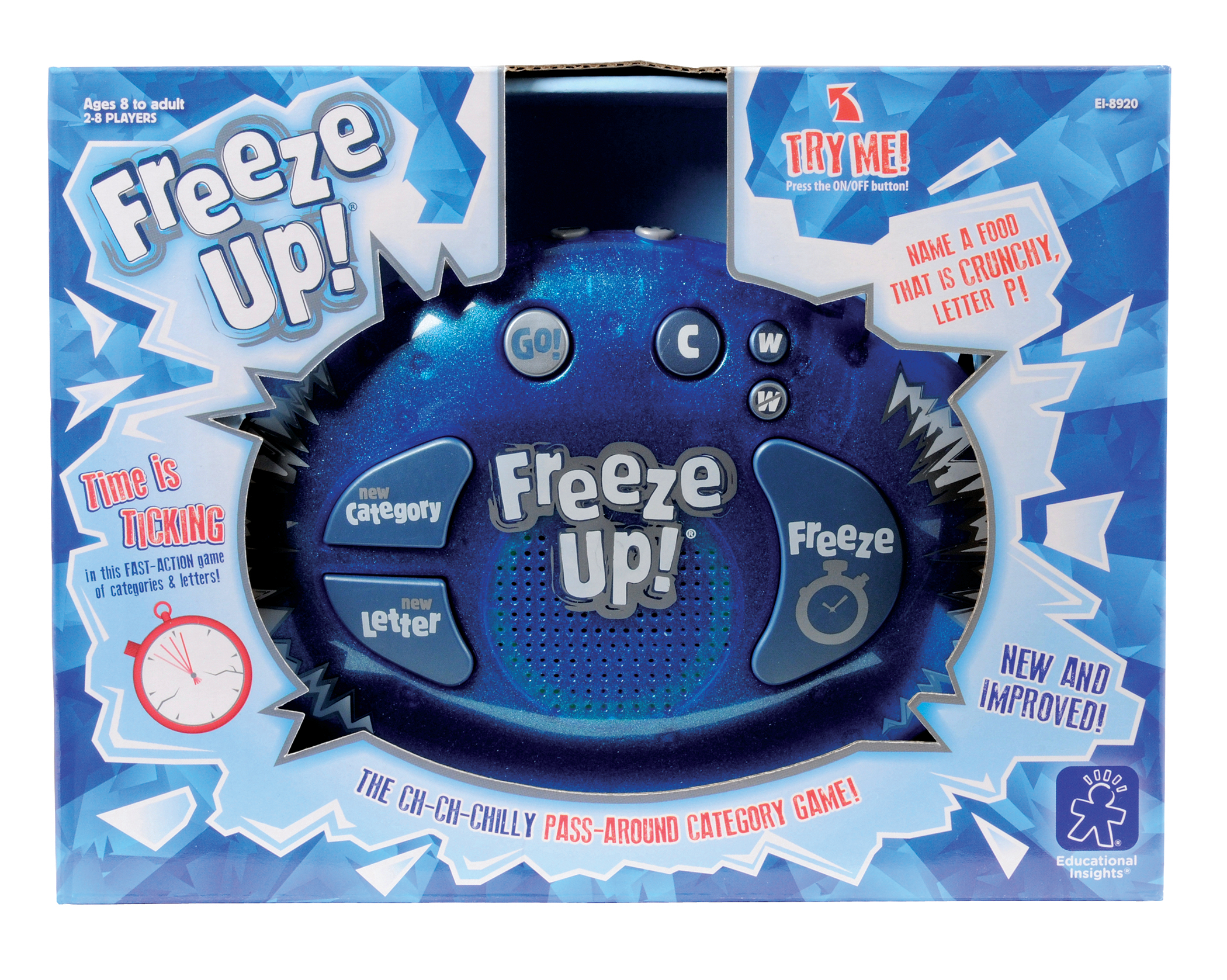 SKU 8920 Product Title FREEZE UP Brand Name Educational Insights UPC 086002089205 Piece Count 0 Min Target Age 8 Max Target Age 12 TargetGradeMax Seventh Grade TargetGradeMin Third Grade ProductCategoryProductLine Preschool Games ProductCategorySubject Games Port of Exit CNYTN Country of Origin CHN Unit Height 2.9 Unit Length 9.9 Unit Weight 0.9 Unit Width 7.6 Long Description - DC Let's play Freeze Up, the keep-your-cool, countdown category game. Quick. Name an animal that starts with C. How about a fruit that starts with B or a flower that starts with T? Sounds easy, right? No clue? Losing time? Press the button to change the category or the letter. Think fast, but think smart—other players may challenge your answer. With the clock ticking, players must keep their cool and answer before their time's up and they're frozen out. The last player left in this fast-paced electronic category game is the Freeze Up ch-ch-ch-champion. Features two challenging ways to play—nail-biting AUTO mode and self-paced MANUAL mode—plus 170+ think-quick categories, built-in timer and scorekeeper, crystal-clear speech, and fun sound effects. Fun for the entire family. Requires 3 AA batteries (included). For 2 to 8 players. CA prop 65 No Case Height 11.5 Case Length 15.8 Case Quantity 6 Case Weight 6.35 CPQ 0.97 Includes Remote No Marble Warning No MSRP 27.99 Small Ball Warning No Small Parts Warning No