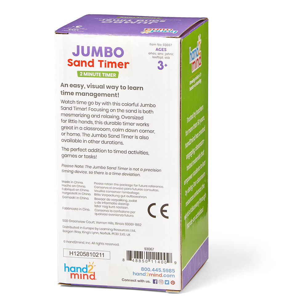 SKU 93067 Product Title JUMBO SAND TIMER, 2 MIN Brand Name hand2mind UPC 848850114009 Piece Count 1 Min Target Age 4 Max Target Age 12 TargetGradeMax Seventh Grade TargetGradeMin Pre-K ProductCategoryProductLine Timers ProductCategoryProductType Classroom Supplies ProductCategorySubject Math Country of Origin CHN Unit Height 7 Unit Length 7.2 Unit Weight 0.66 Unit Width 3.5 CA prop 65 No Case Height 8.8 Case Length 15.1 Case Quantity 12 Case Weight 9.75 CPQ 0.89 Includes Remote No Marble Warning No MSRP 19.99 Small Ball Warning No Small Parts Warning No