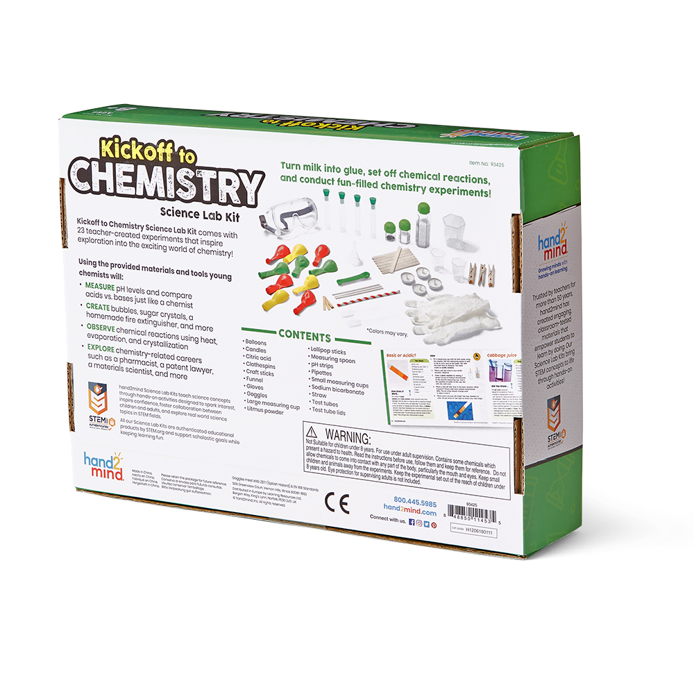 SKU 93425 Product Title SCIENCE LAB KIT, KICKOFF TO CHEMISTRY Brand Name hand2mind UPC 848850114535 Piece Count 66 Min Target Age 8 Max Target Age 13 TargetGradeMax Eighth Grade TargetGradeMin Third Grade ProductCategoryProductLine Consumer Science Lab Kit ProductCategoryProductType Educational Toy ProductCategorySubject Science/STEM Country of Origin CHN Unit Height 9.4 Unit Length 13.1 Unit Weight 1.55 Unit Width 3 CA prop 65 No Case Height 19.8 Case Length 17.2 Case Quantity 12 Case Weight 21.15 CPQ 3.37 Includes Remote No Marble Warning No MSRP 39.99 Small Ball Warning No Small Parts Warning No