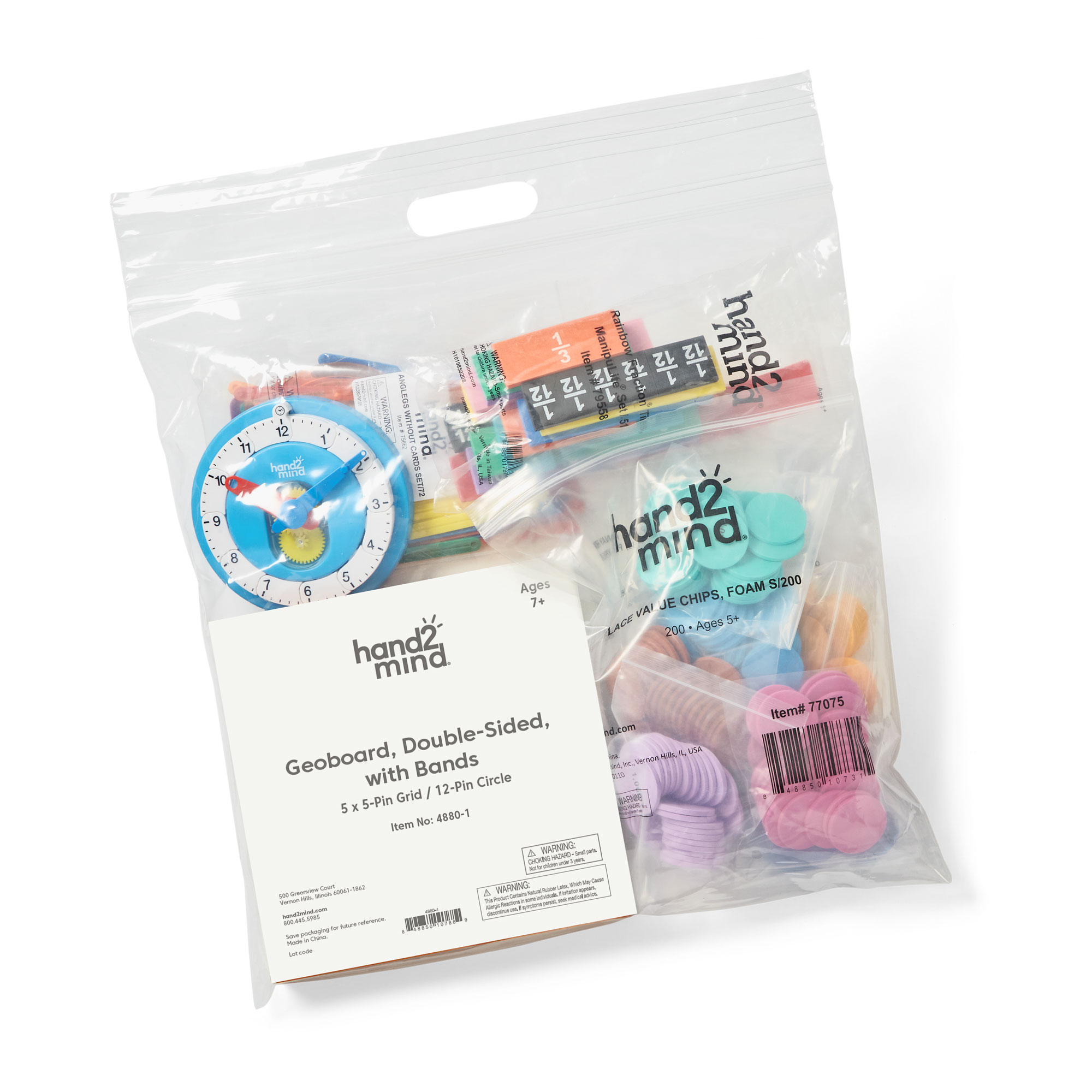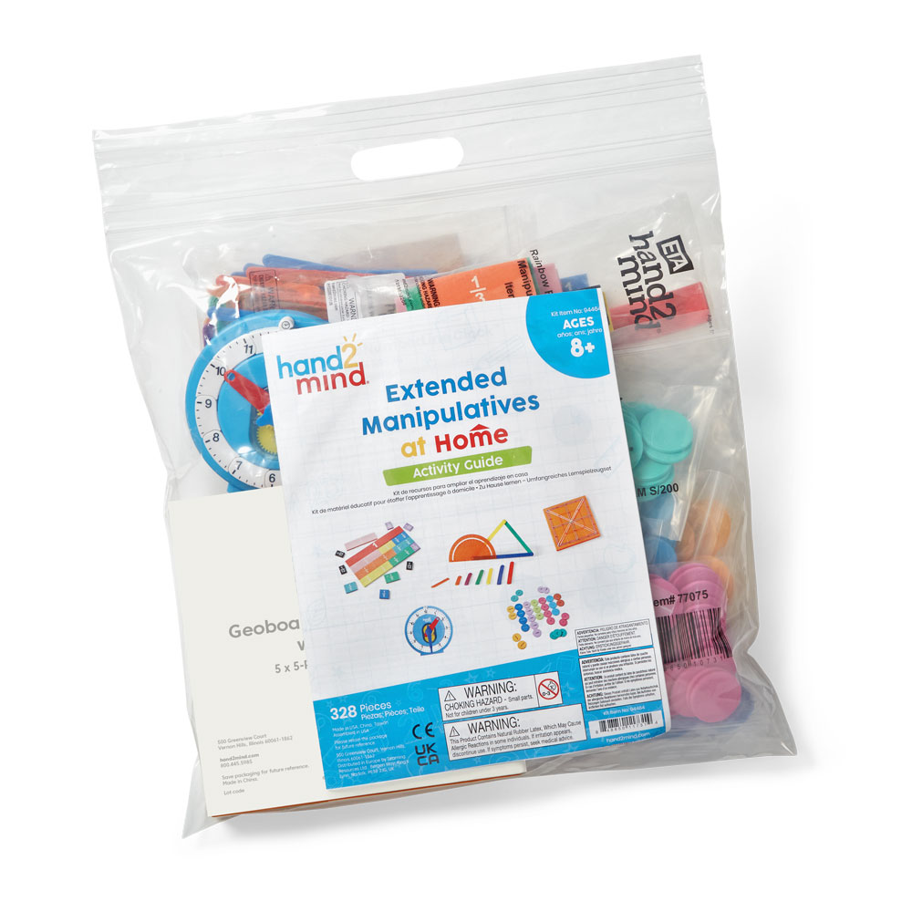 SKU 94464 Product Title MANIPULATIVES AT HOME KIT, EXT, AGES 8+ Brand Name hand2mind UPC 848850117314 Piece Count 328 Min Target Age 8 Max Target Age 10 TargetGradeMax Fifth Grade TargetGradeMin Third Grade ProductCategoryProductLine Single Student Manipulative Kit ProductCategoryProductType Manipulative - Individual/Student ProductCategorySubject Math Country of Origin USA Unit Height 3.5 Unit Length 9 Unit Weight 1.1 Unit Width 11.5 CA prop 65 No Case Height 12.5 Case Length 24.1 Case Quantity 15 Case Weight 18.4 CPQ 3.23 Includes Remote No Marble Warning No MSRP 39.99 Small Ball Warning No Small Parts Warning No