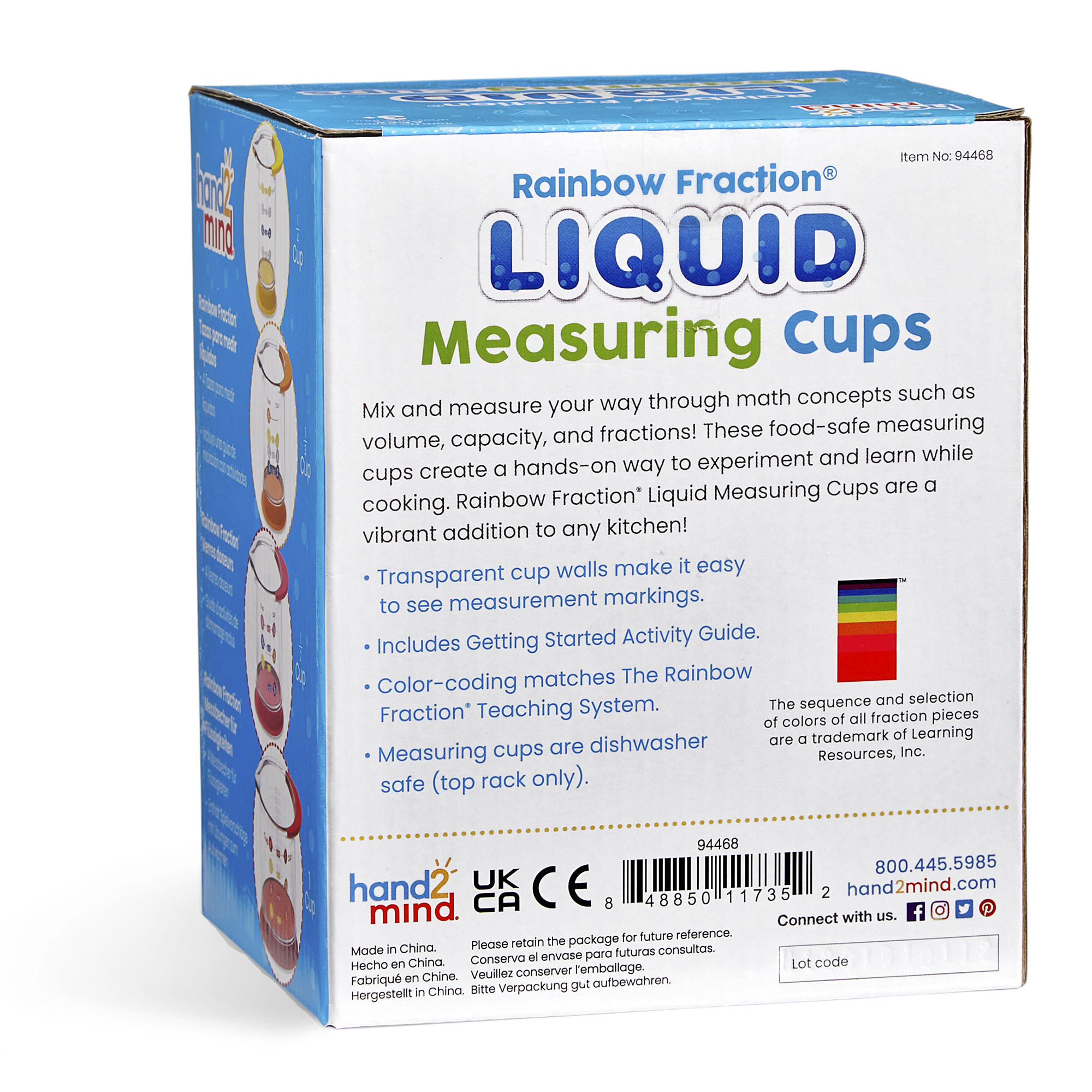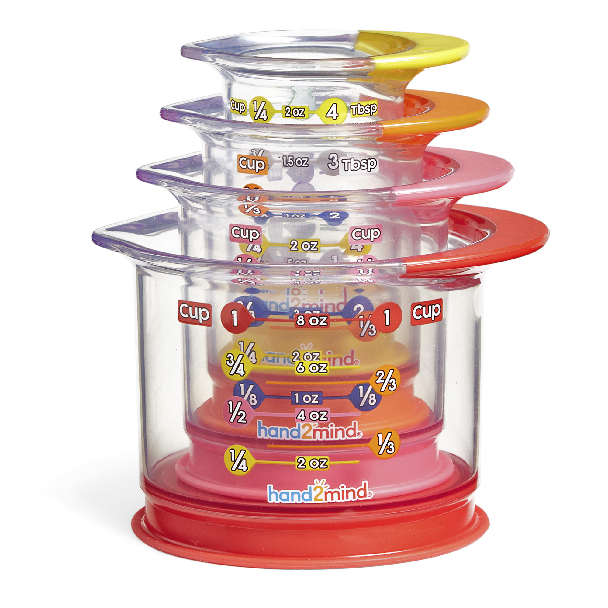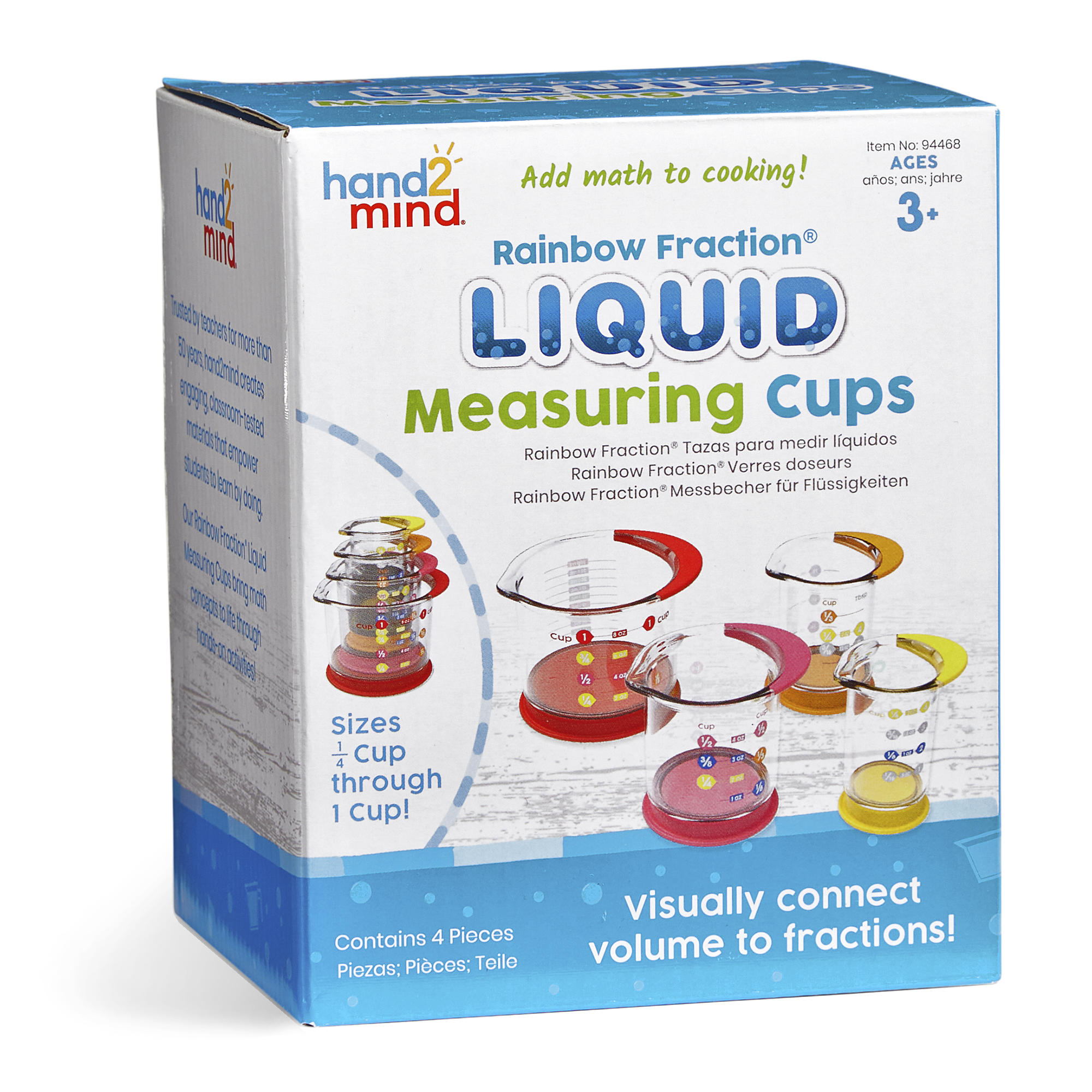SKU 94468 Product Title RAINBOW FRACTION® LIQUID MEASURING CUPS Brand Name hand2mind UPC 848850117352 Piece Count 4 Min Target Age 4 Max Target Age 10 TargetGradeMax Fifth Grade TargetGradeMin Pre-K ProductCategoryProductLine Rainbow Fraction ProductCategoryProductType Manipulative - Individual/Student ProductCategorySubject Math Country of Origin CHN Unit Height 5.6 Unit Length 4.1 Unit Weight 0.65 Unit Width 4.7 CA prop 65 No Case Height 12.3 Case Length 14.6 Case Quantity 12 Case Weight 8.7 CPQ 0.9 Includes Remote No Marble Warning No MSRP 16.99 Small Ball Warning No Small Parts Warning No