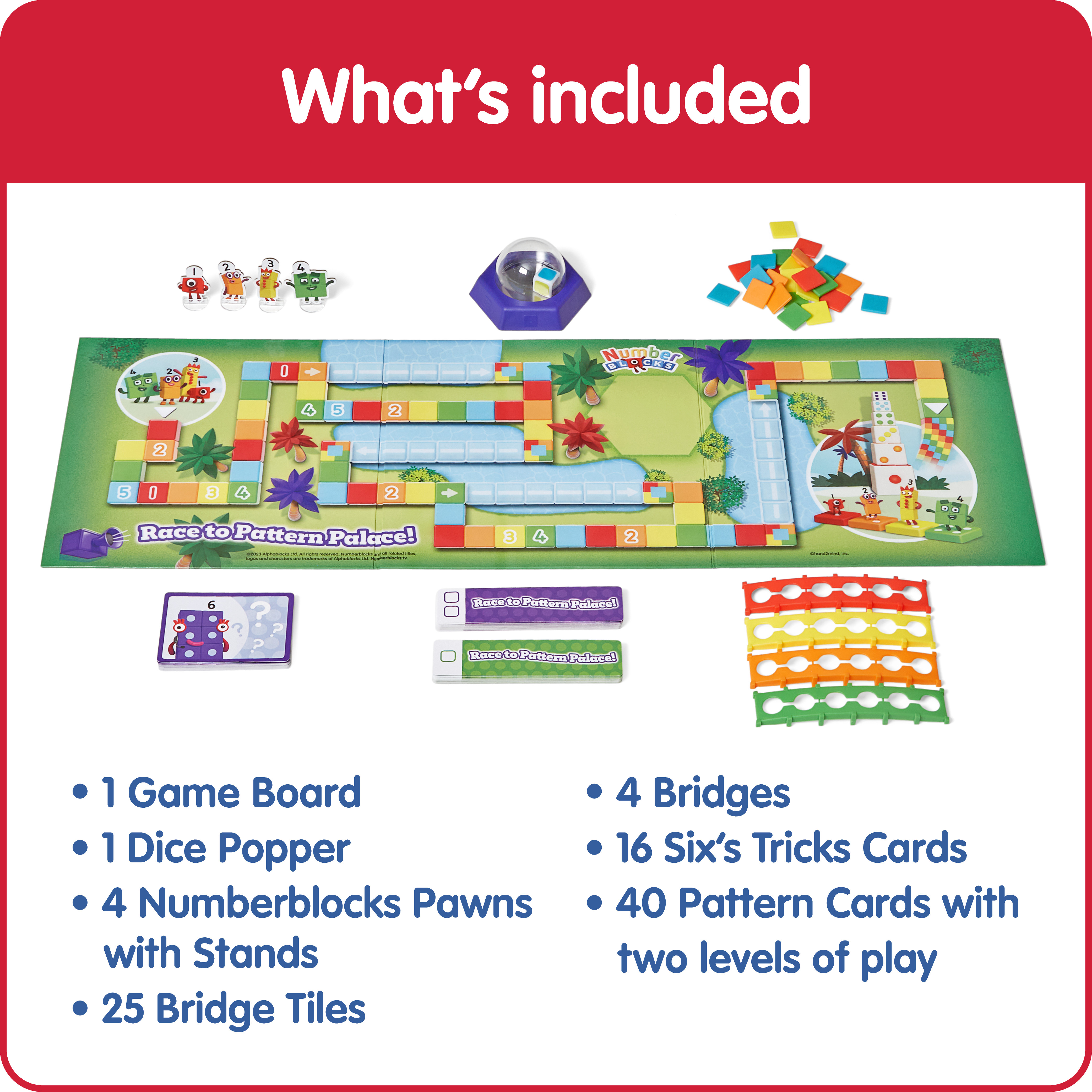 SKU 95400 Product Title Numberblocks, Race to Pattern Palace Brand Name Numberblocks UPC 848850115297 Piece Count 91 Min Target Age 3 Max Target Age 6 TargetGradeMax First Grade TargetGradeMin Pre-K ProductCategoryProductLine Numberblocks ProductCategoryProductType Educational Toy ProductCategorySubject Math Country of Origin CHN Unit Height 9.6 Unit Length 2.4 Unit Weight 1.4 Unit Width 10.12 CA prop 65 No Case Height 10.5 Case Length 10.9 Case Quantity 6 Case Weight 8.95 CPQ 1.01 Includes Remote No Marble Warning No MSRP 21.99 Small Ball Warning No Small Parts Warning No