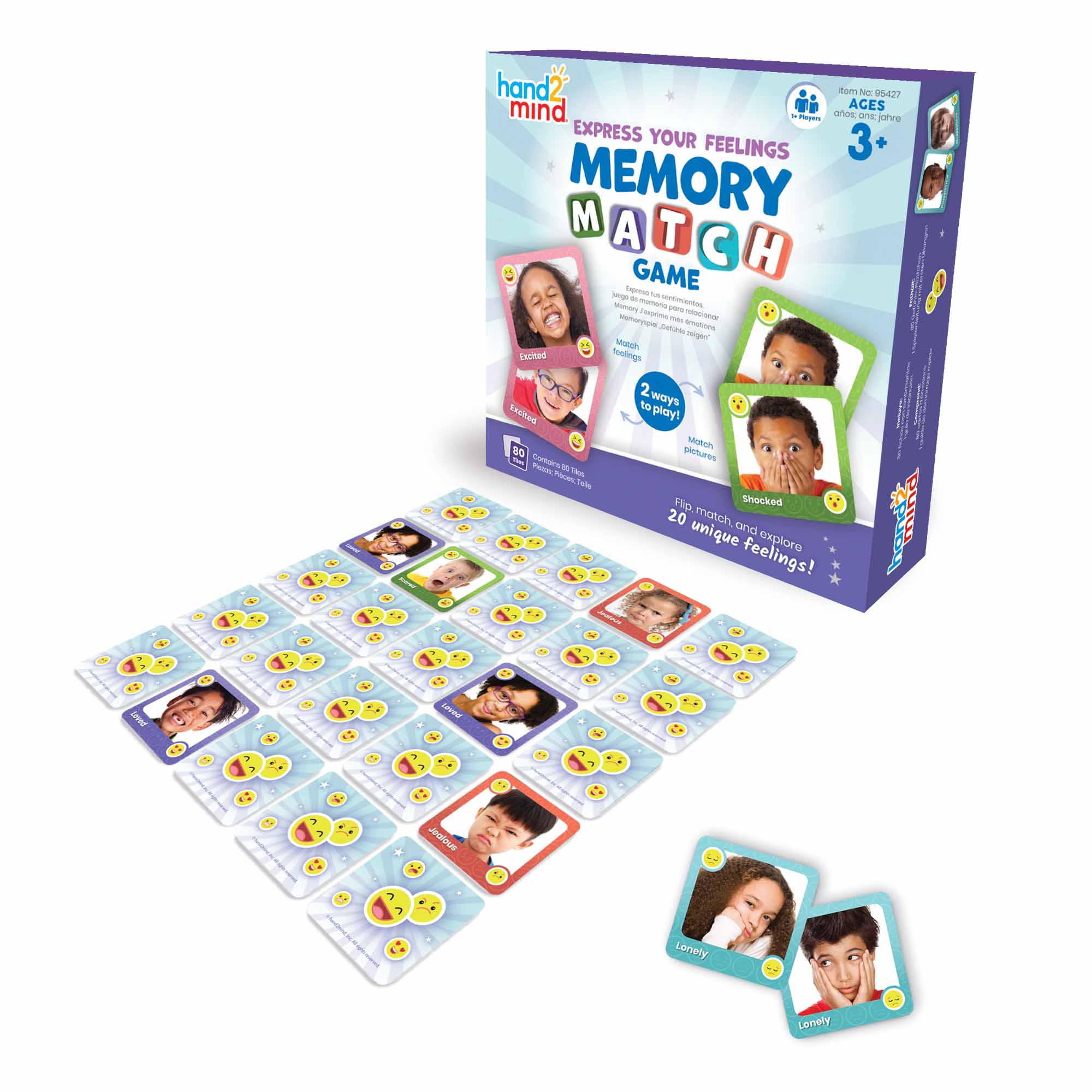 SKU 95427 Product Title Express Your FeelingsTM Memory Match Game Brand Name hand2mind UPC 848850118755 Piece Count 0 Min Target Age 3 Max Target Age 7 TargetGradeMax Second Grade TargetGradeMin Pre-K ProductCategoryProductLine Feelings and Emotions ProductCategoryProductType Game ProductCategorySubject Social-Emotional Learning Country of Origin IND Unit Height 7.2 Unit Length 7.5 Unit Weight 1 Unit Width 1.6 CA prop 65 No Case Height 8.8 Case Length 11.2 Case Quantity 12 Case Weight 11.75 CPQ 0.87 Includes Remote No Marble Warning No MSRP 10.99 Small Ball Warning No Small Parts Warning No