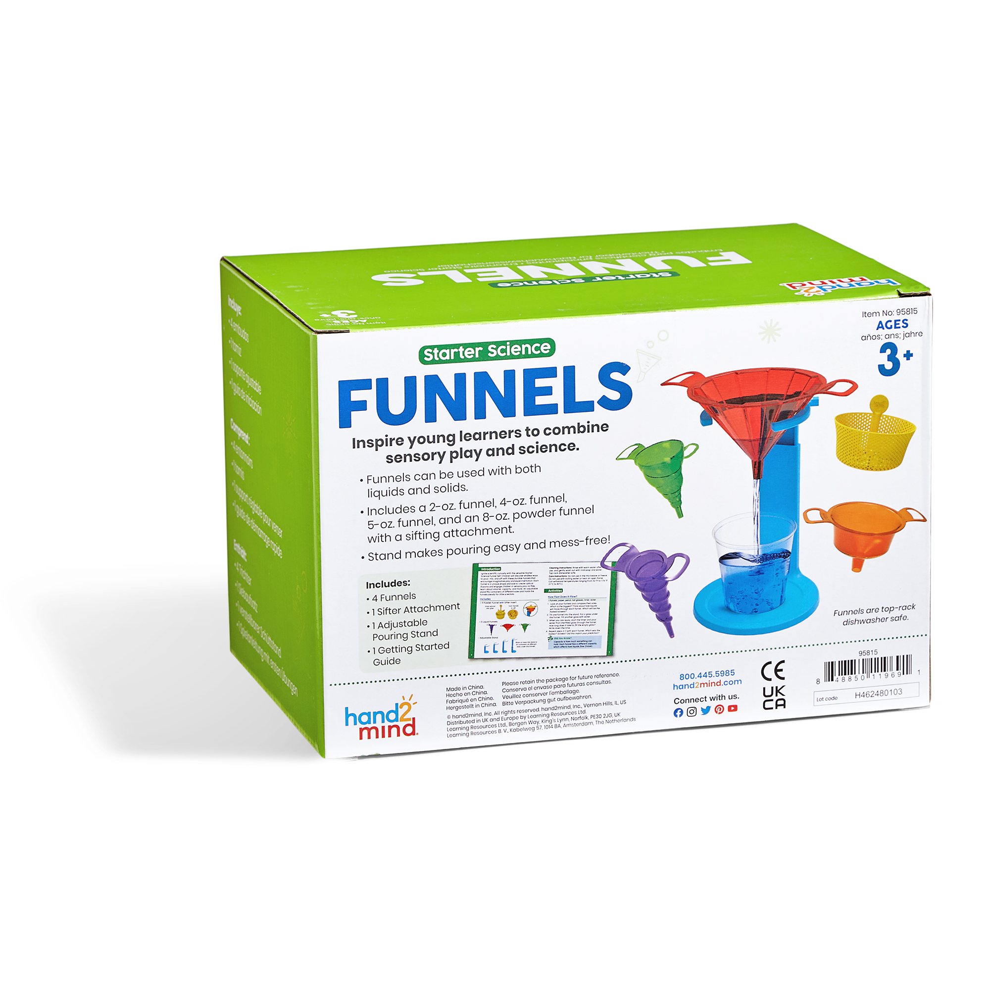 SKU 95815 Product Title STARTER SCIENCE FUNNELS, S/4 Brand Name hand2mind UPC 848850119691 Piece Count 0 Min Target Age 3 Max Target Age 7 TargetGradeMax Second Grade TargetGradeMin Pre-K ProductCategoryProductLine Consumer Science Lab Kit ProductCategoryProductType Educational Toy ProductCategorySubject Science/STEM Country of Origin CHN Unit Height 8.5 Unit Length 8.4 Unit Weight 0.75 Unit Width 5.67 CA prop 65 No Case Height 12.4 Case Length 17 Case Quantity 12 Case Weight 11.02 CPQ 2.13 Includes Remote No Marble Warning No MSRP 15.99 Small Ball Warning No Small Parts Warning No