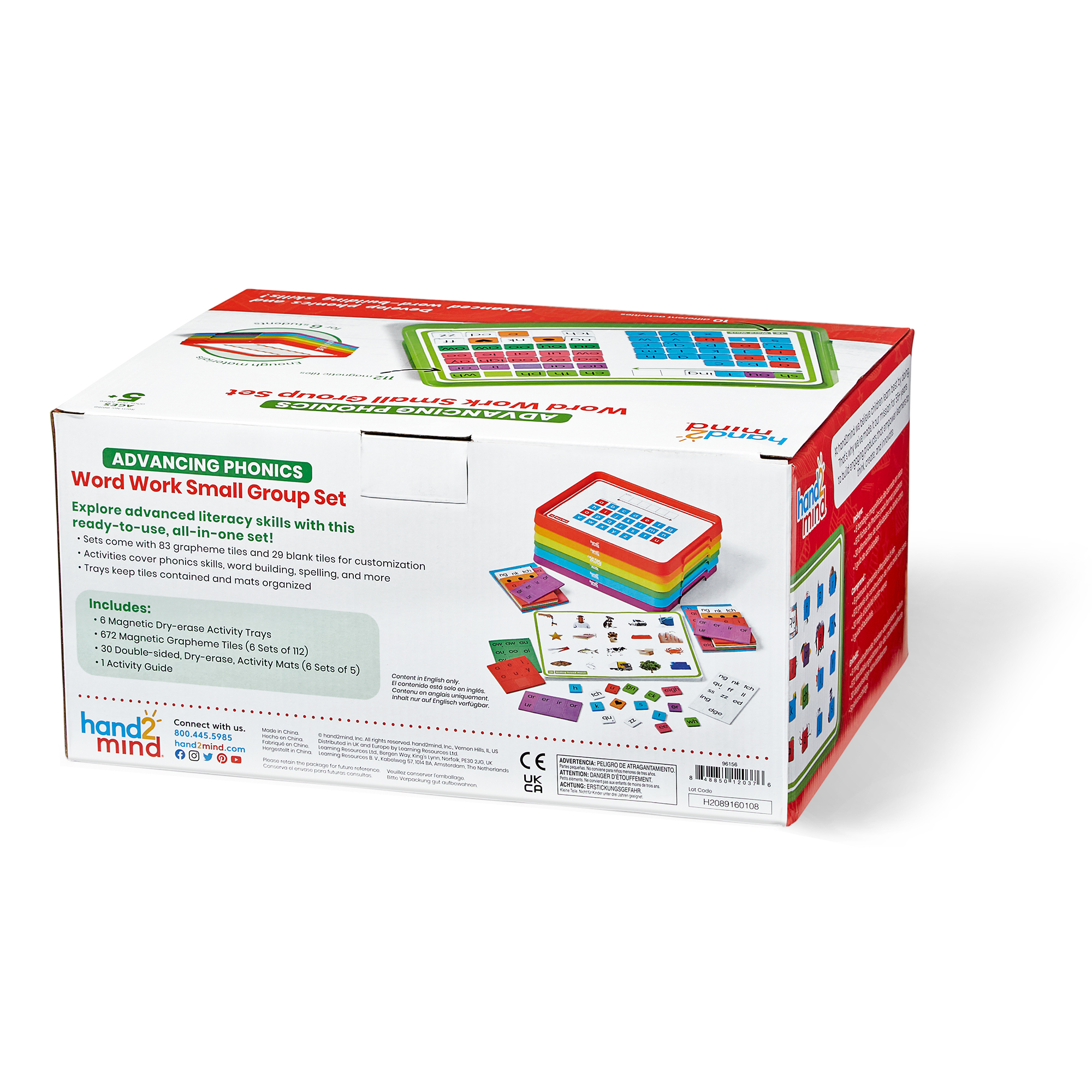 SKU 96156 Product Title Advancing Phonics Word Work Small Group Set Brand Name hand2mind UPC 848850120376 Piece Count 0 Min Target Age 5 Max Target Age 8 TargetGradeMax Third Grade TargetGradeMin Kindergarten ProductCategoryProductLine Phonics and Phonemic Awareness ProductCategoryProductType Manipulative - Small Group or Center ProductCategorySubject ELA/Literacy Country of Origin CHN Unit Height 10.4 Unit Length 6.8 Unit Weight 8.75 Unit Width 13.6 CA prop 65 No Case Height 15.1 Case Length 11.2 Case Quantity 2 Case Weight 18.35 CPQ 1.38 Includes Remote No Marble Warning No MSRP 99.99 Small Ball Warning No Small Parts Warning No