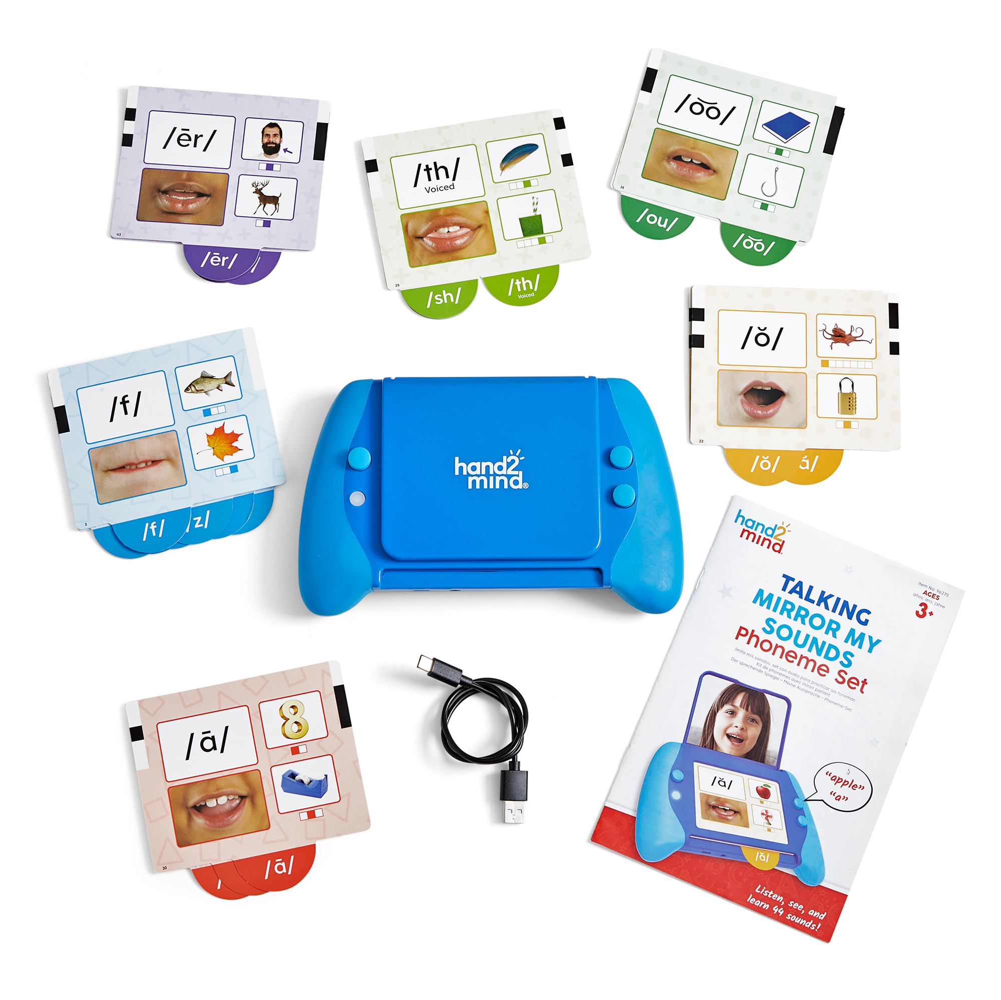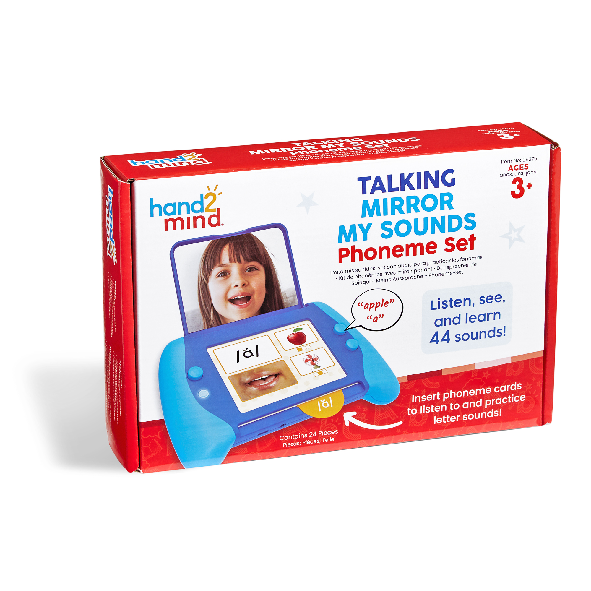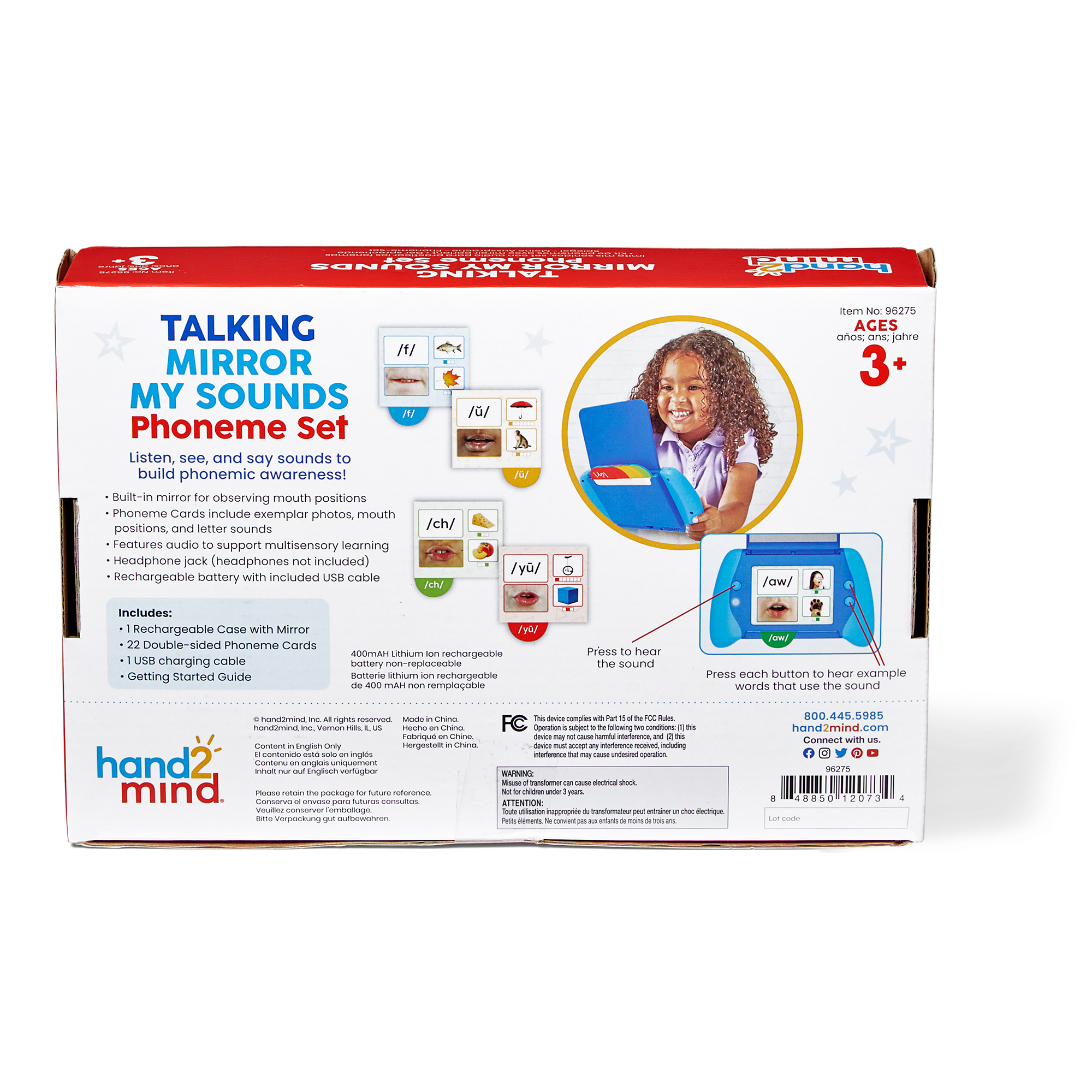 SKU 96275 Product Title Talking Mirror My Sounds Phoneme Set Brand Name hand2mind UPC 848850120734 Piece Count 0 Min Target Age 3 Max Target Age 8 TargetGradeMax Third Grade TargetGradeMin Pre-K ProductCategoryProductLine Phonics and Phonemic Awareness ProductCategoryProductType Educational Toy ProductCategorySubject ELA/Literacy Country of Origin CHN Unit Height 2 Unit Length 6.4 Unit Weight 1.1 Unit Width 9.5 CA prop 65 No Case Height 10.7 Case Length 6.9 Case Quantity 4 Case Weight 5.05 CPQ 0.38 Includes Remote No Marble Warning No MSRP 27.99 Small Ball Warning No Small Parts Warning No