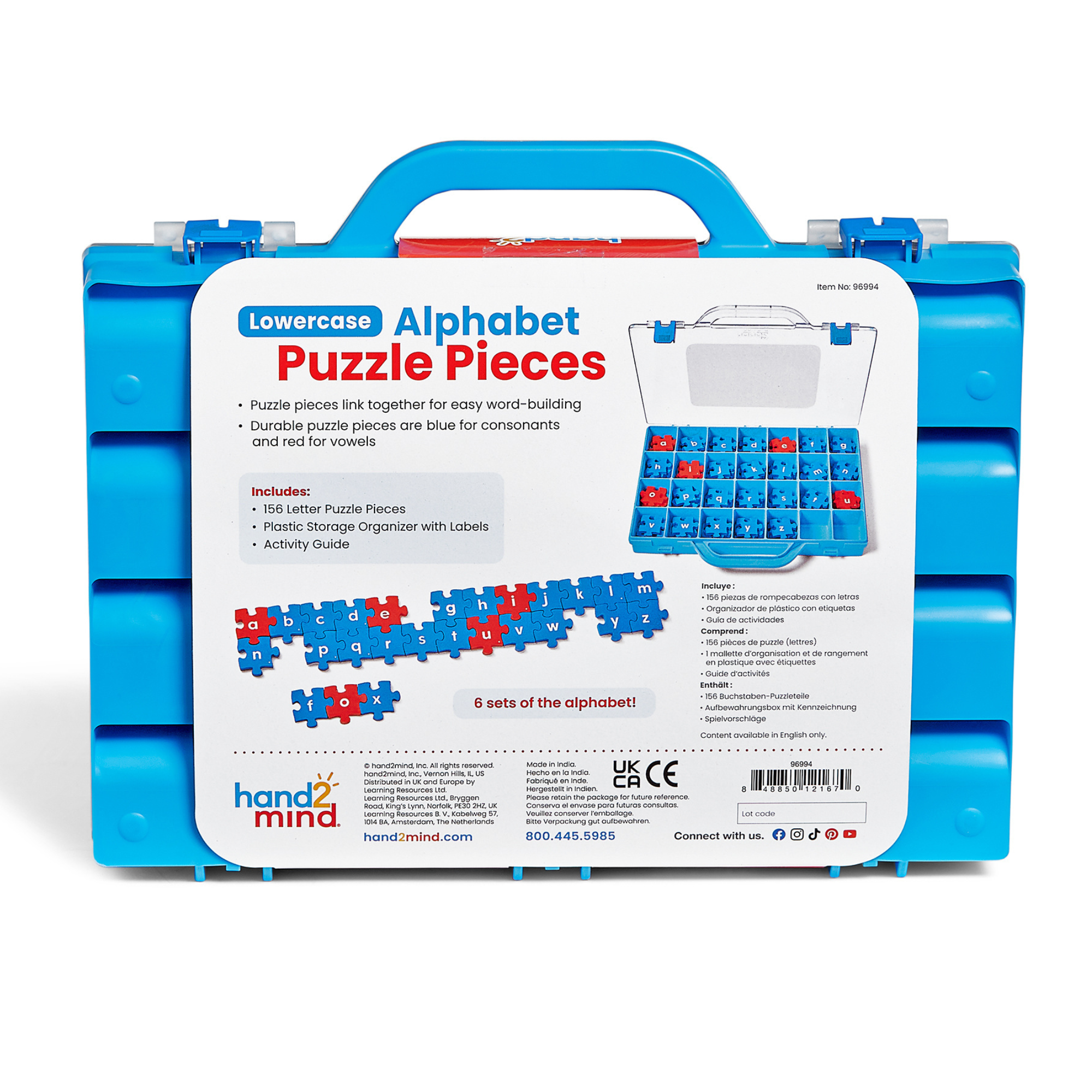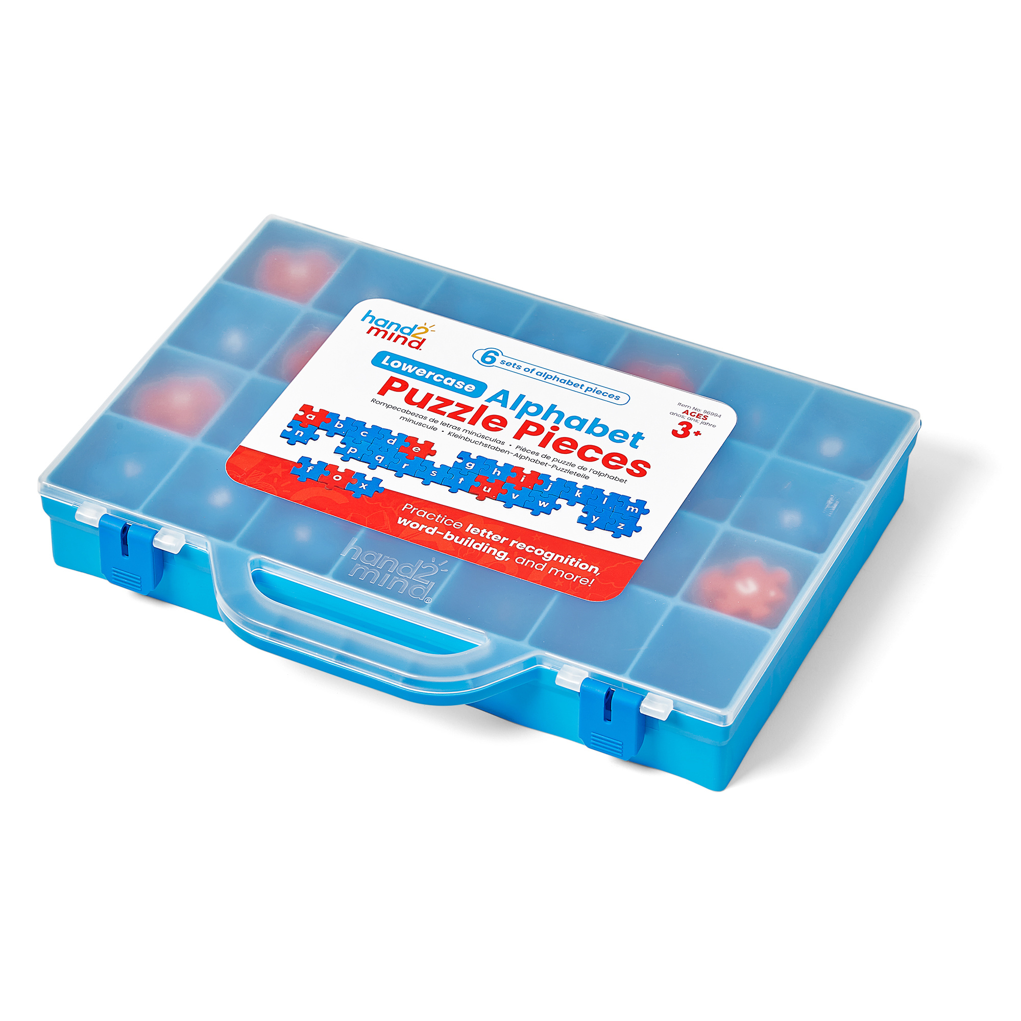 SKU 96994 Product Title Lowercase Alphabet Puzzle Pieces Brand Name hand2mind UPC 848850121670 Piece Count 156 Min Target Age 3 Max Target Age 8 TargetGradeMax Third Grade TargetGradeMin Pre-K ProductCategoryProductLine Phonics and Phonemic Awareness ProductCategoryProductType Manipulative - Small Group or Center ProductCategorySubject ELA/Literacy Country of Origin IND Unit Height 1.9 Unit Length 9.2 Unit Weight 1.95 Unit Width 12.4 CA prop 65 No Case Height 10.4 Case Length 11.8 Case Quantity 6 Case Weight 13.4 CPQ 0.9 Includes Remote No Marble Warning No MSRP 20.99 Small Ball Warning No Small Parts Warning No