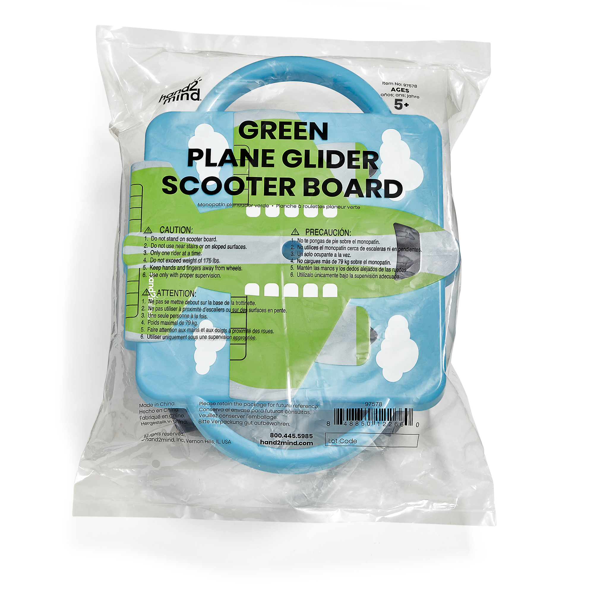 SKU 97578 Product Title Plane Glider Scooter Board, Green Brand Name hand2mind UPC 848850122660 Piece Count 0 Min Target Age 5 Max Target Age 8 TargetGradeMax Third Grade TargetGradeMin Kindergarten ProductCategoryProductLine Scooters ProductCategoryProductType Classroom Supplies ProductCategorySubject Physical Education Country of Origin CHN Unit Height 4 Unit Length 16.45 Unit Weight 2.15 Unit Width 10.4 CA prop 65 No Case Height 17.3 Case Length 10.8 Case Quantity 4 Case Weight 10.7 CPQ 1.85 Includes Remote No Marble Warning No MSRP 29.99 Small Ball Warning No Small Parts Warning No